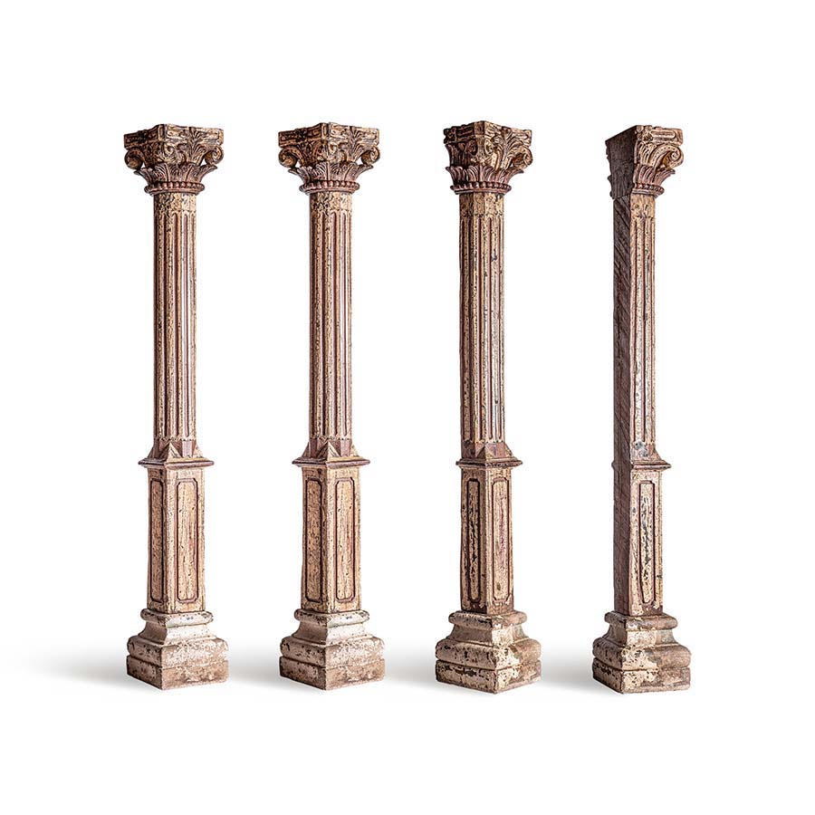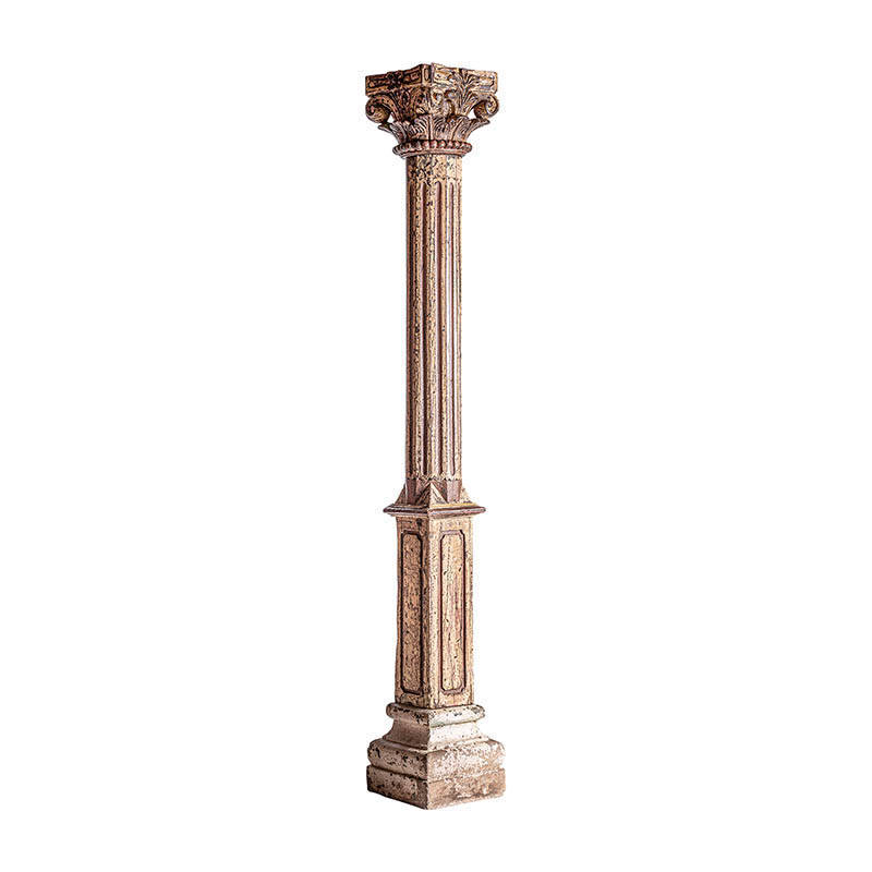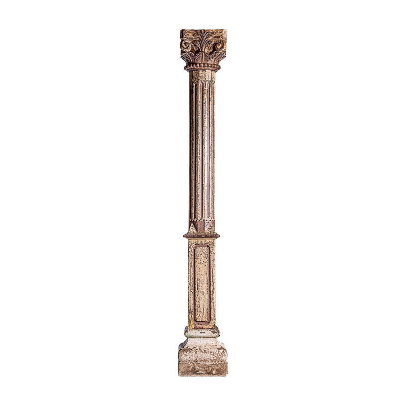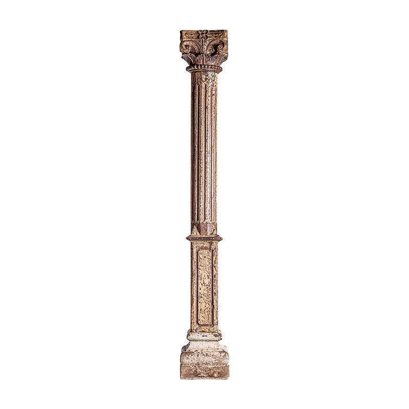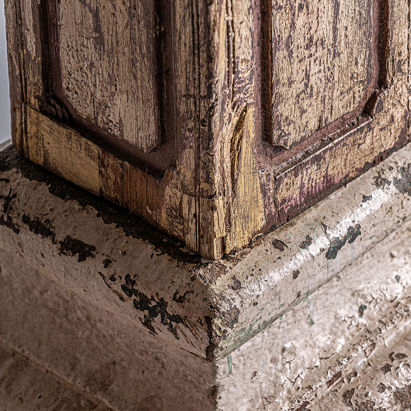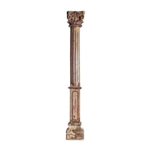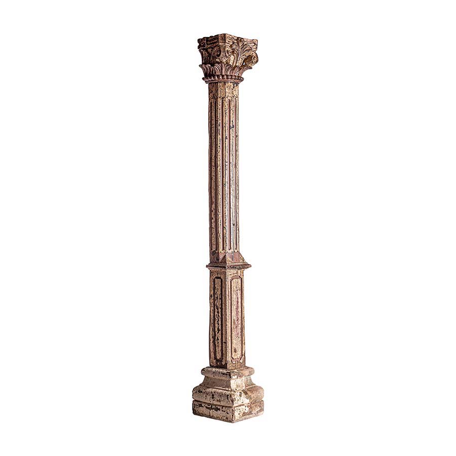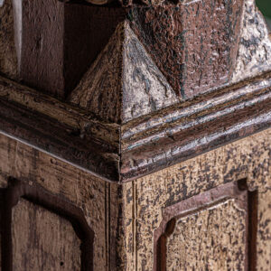 Columna Byron de estilo étnico fabricado en madera antigua en color marrón con acabado envejecido combinado con piedra.