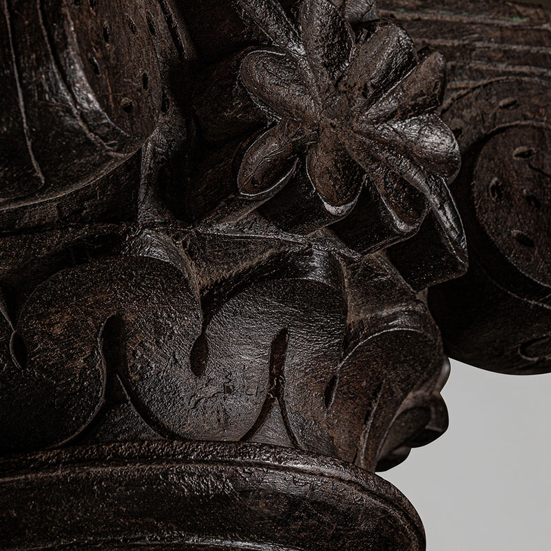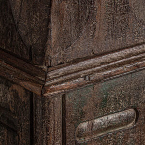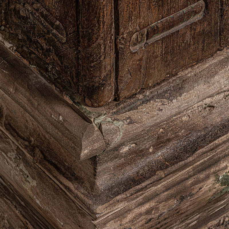 Columna Byron de estilo étnico fabricado en madera antigua en color marrón con acabado envejecido combinado con piedra.
