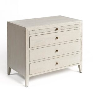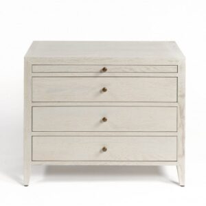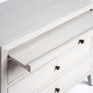 Cómoda o mesita de noche de madera acabado en roble color blanco grisáceo patinado. Cajones de la misma madera. Cuenta con tres cajones y un cajón tipo bandeja en la parte superior. Es ideal como mesita de noche de dimensiones superiores para dar calidez al dormitorio o utilizar como cómoda para un espacio reducido. También combinable con otros modelos de mesita de noche para dar contraste a la habitación y esta a la última en tendencia.