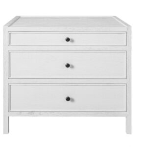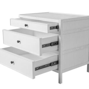 Cómoda acabado madera de roble blanco y 3 cajones con tiradores de metal en negro. Una pequeña cómoda o una mesita de noche amplia para guardar tus pertenencias más personales a mano en tu zona de descanso. Una mesita de noche blanca de estilo sofisticado y elegante que se adapta a diferentes estilos de decoración.