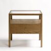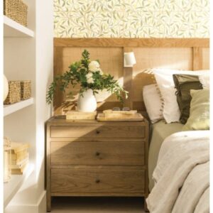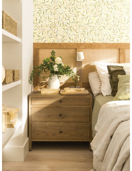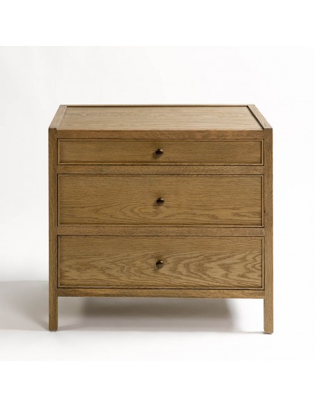 Cómoda de madera acabado en roble color natural con 3 cajones. Cada cajón cuenta con un tirador central y la estructura está suspendida sobre 4 patas de la misma madera.