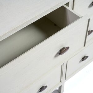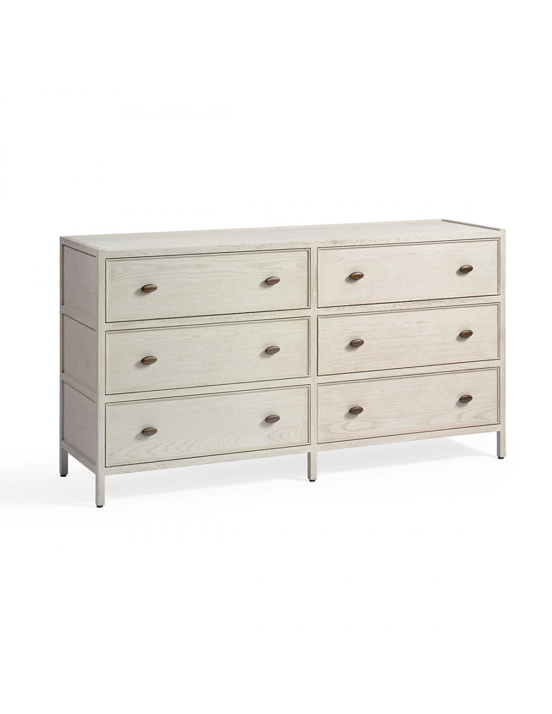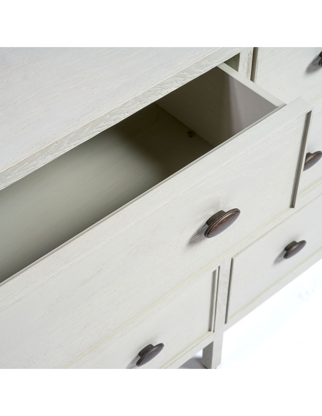 Comoda acabada en madera de roble color blanco grisáceo. Es una pieza perfecta para el dormitorio gracias a su gran capacidad de almacenaje. Un diseño minimalista pero con un toque de detalles muy personales que hacen que se adapte perfectamente a varios estilos decorativos. NOTA: El color puede variar en función de la luz recibida. La tonalidad es un blanco grisáceo. E
