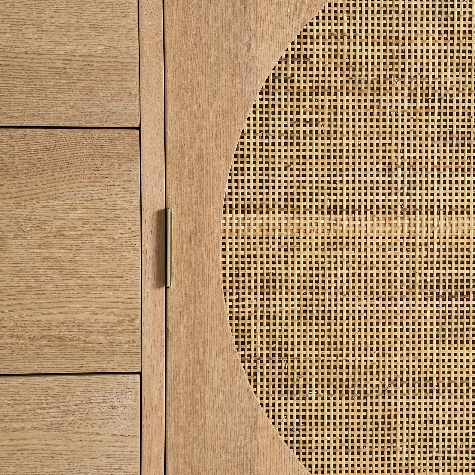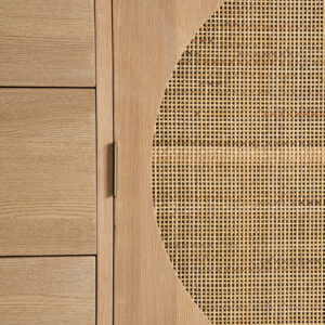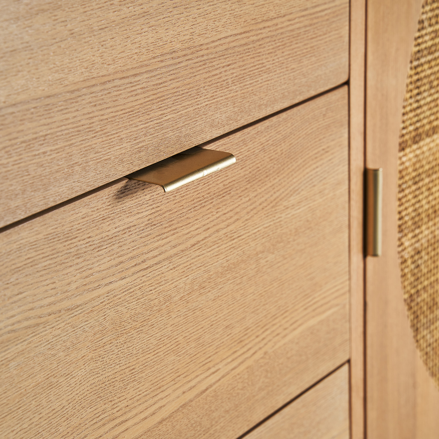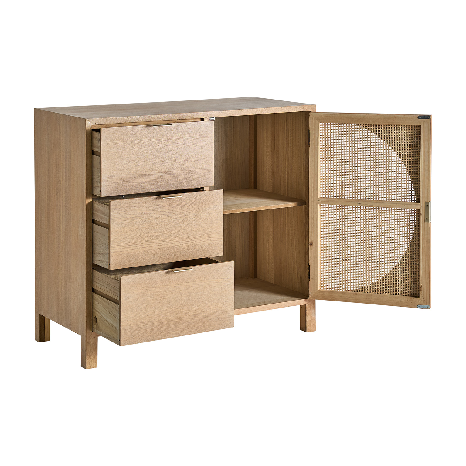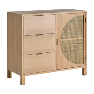 CÓMODA BRACKE, EN COLOR NATURAL, DE ESTILO NÓRDICO. FABRICADO EN MADERA DE PINO, COMBINADO CON RATÁN Y MADERA DM.