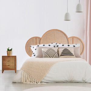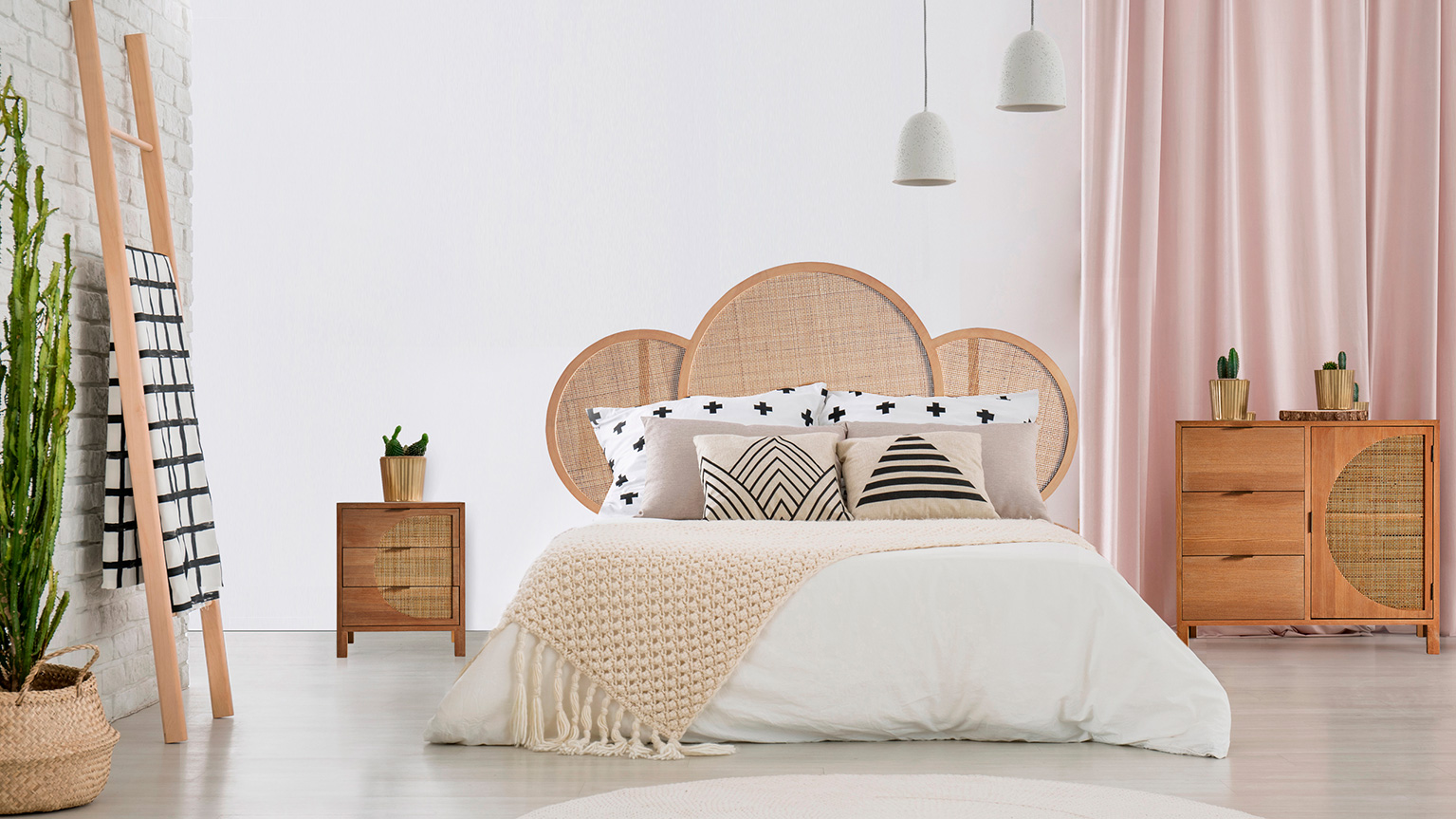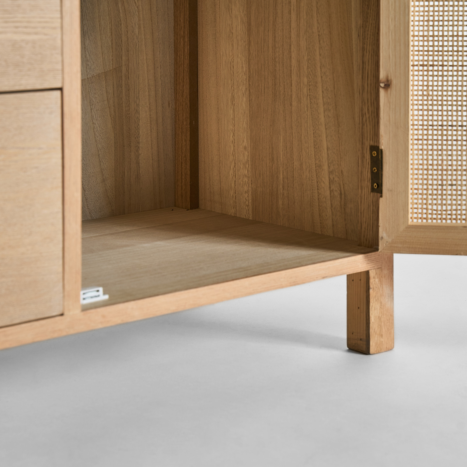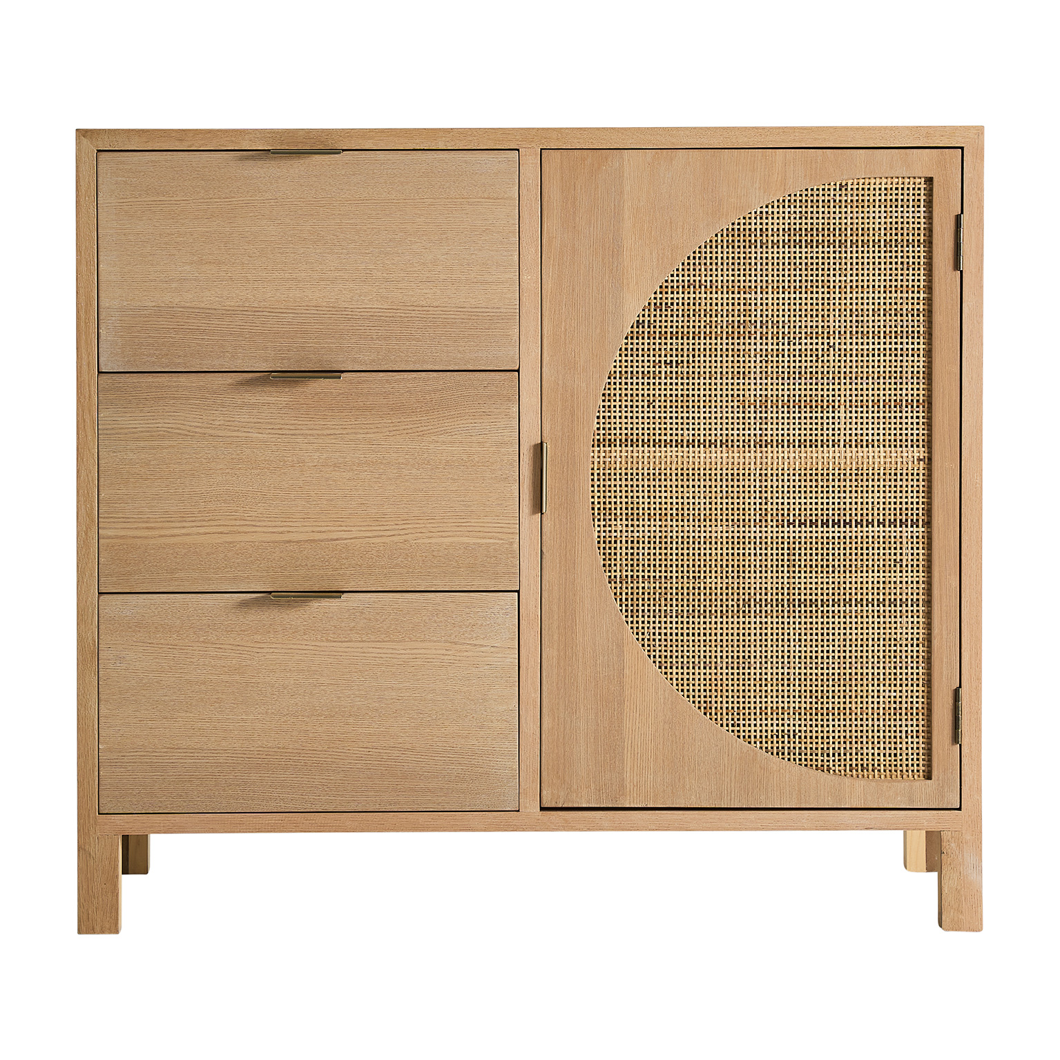 CÓMODA BRACKE, EN COLOR NATURAL, DE ESTILO NÓRDICO. FABRICADO EN MADERA DE PINO, COMBINADO CON RATÁN Y MADERA DM.