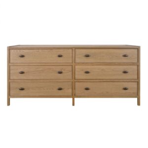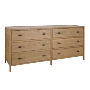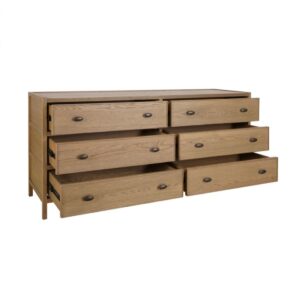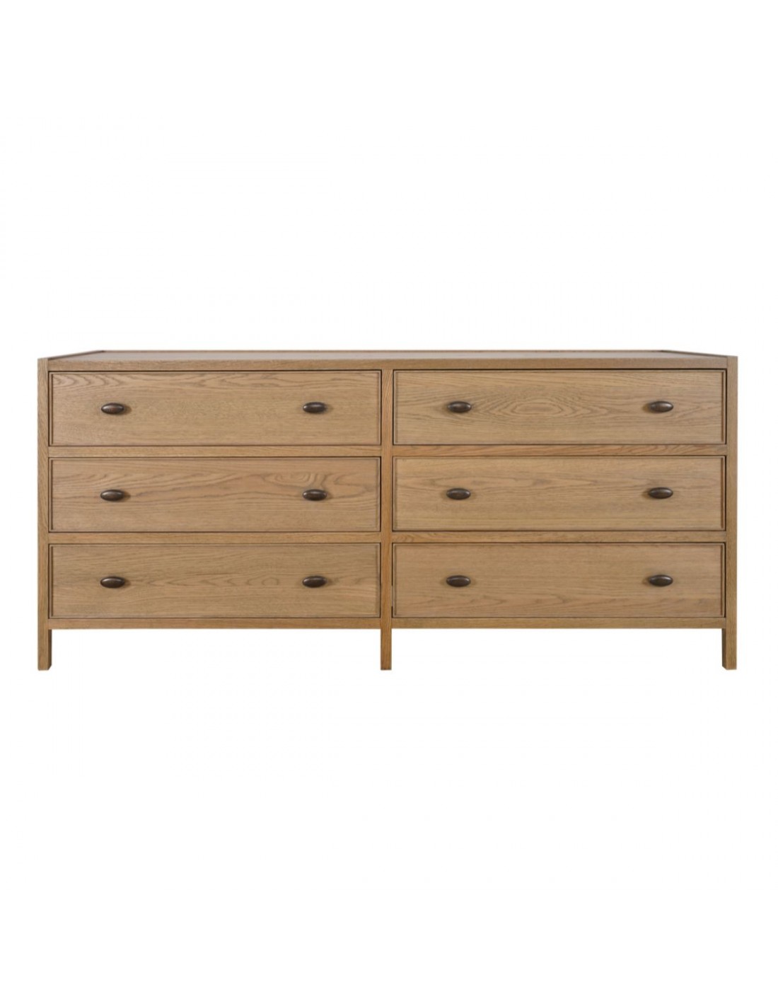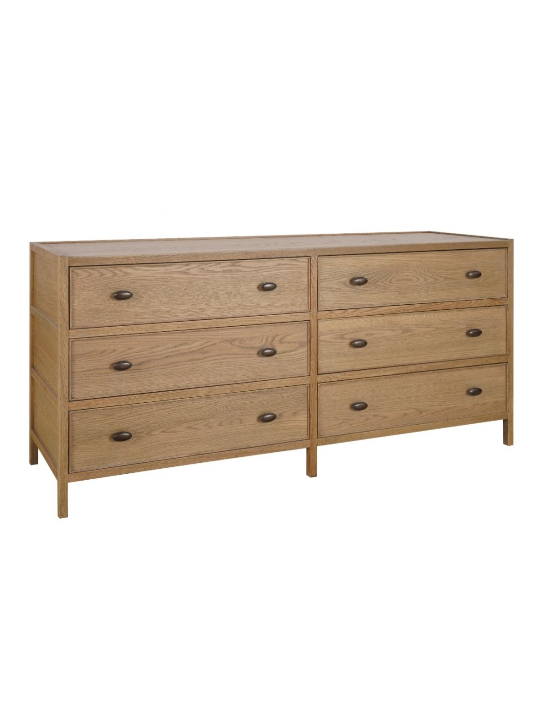 Cómoda acabada en roble natural con gran capacidad de almacenaje. dividida en 6 cajones. Un estilo con toque artesanal de líneas sencillas y sofisticadas. Es ideal para dormitorios de gran tamaño con necesidades de almacenaje, distribuidores o uso como aparador. Disponible también en otras medidas y acabados.