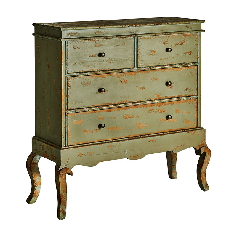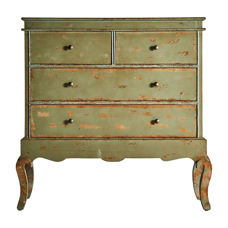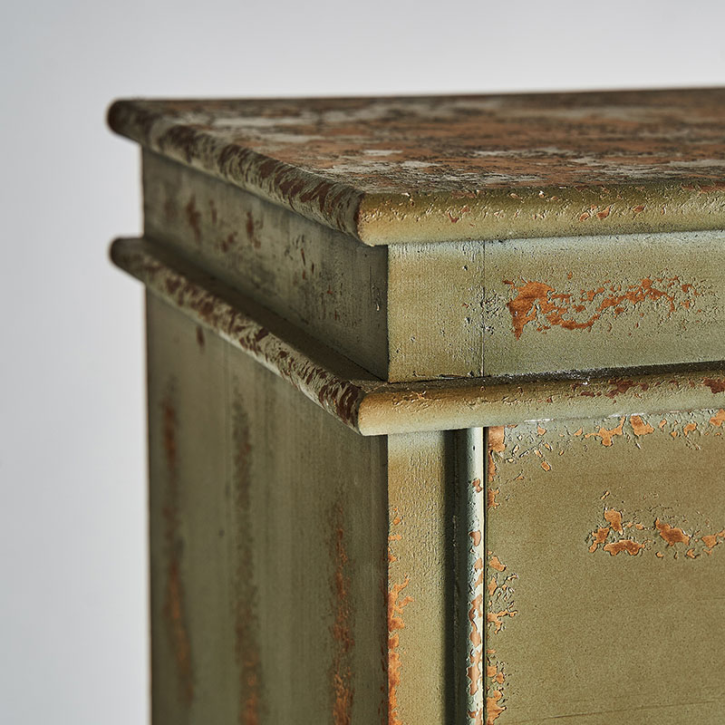 Cómoda formelle en color tonos en verde envejecido de estilo colonial. Fabricado en madera de abeto.