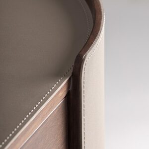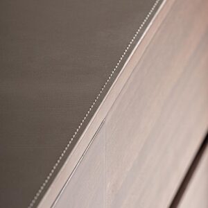 Cómoda Giswil de estilo contemporáneo fabricado en madera contrachapada en color marrón con acabado mate combinado con chapa de eucalipto en color marrón con acabado cepillado y polipiel en color beige con acabado mate.
