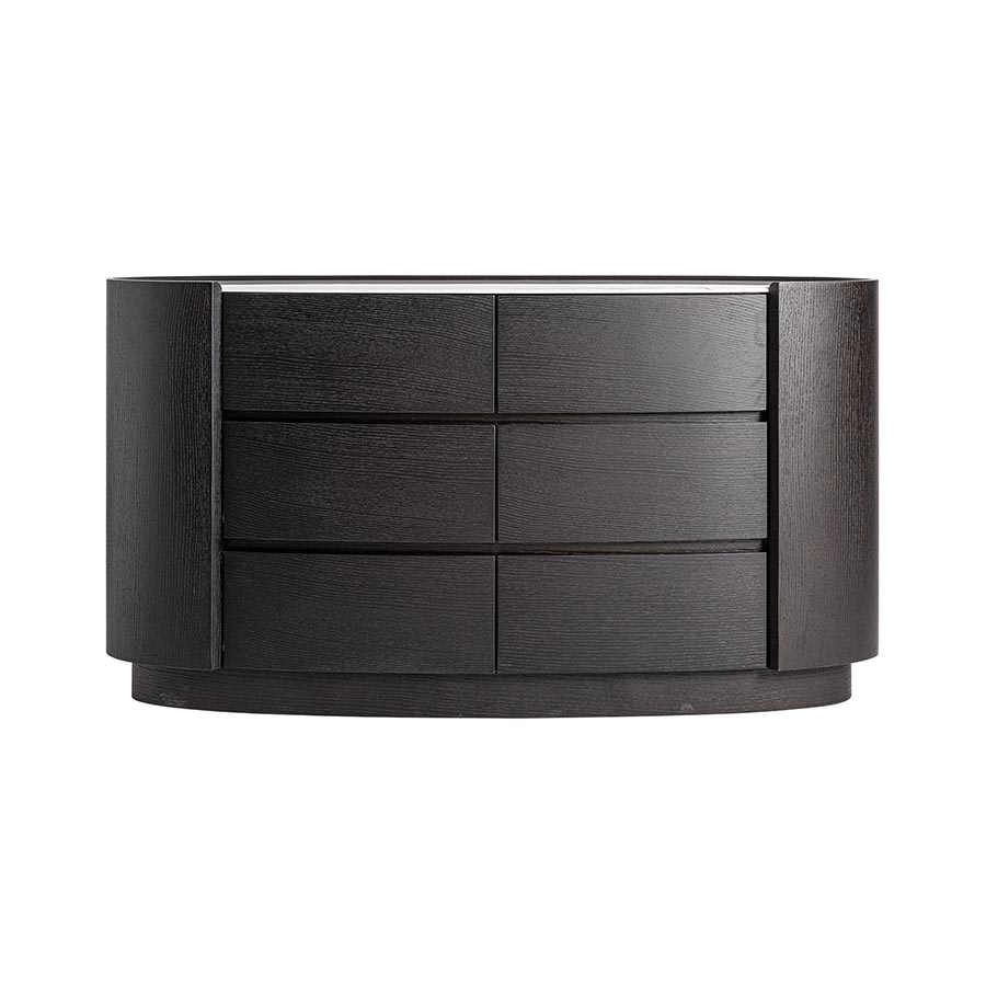 Cómoda Isola de estilo contemporáneo fabricado en madera contrachapada en color negro combinado con chapa de roble en color negra y piedra sinterizada en color blanco.