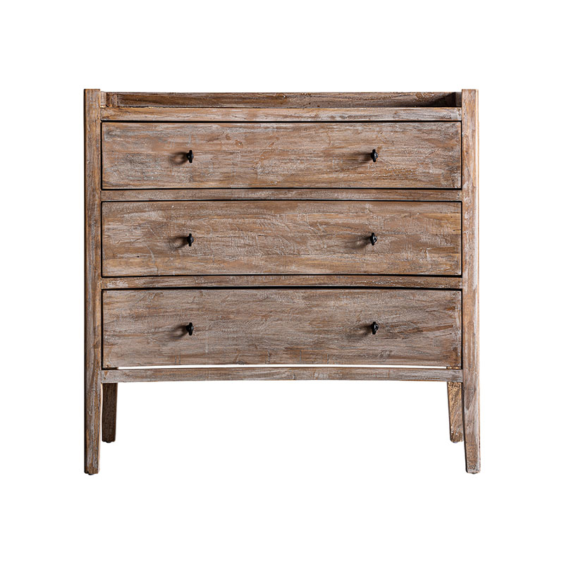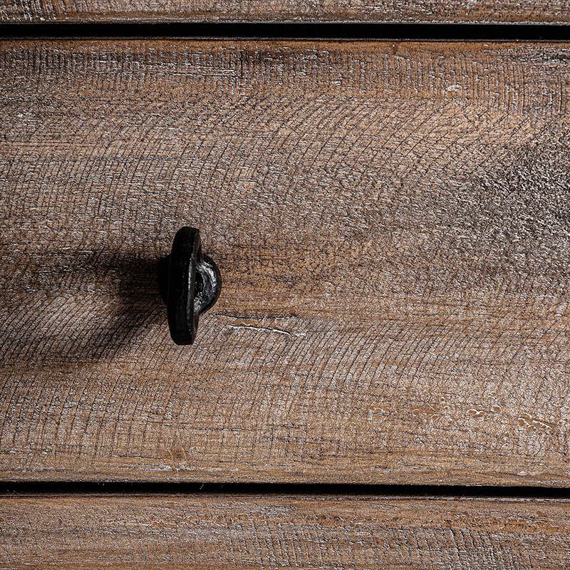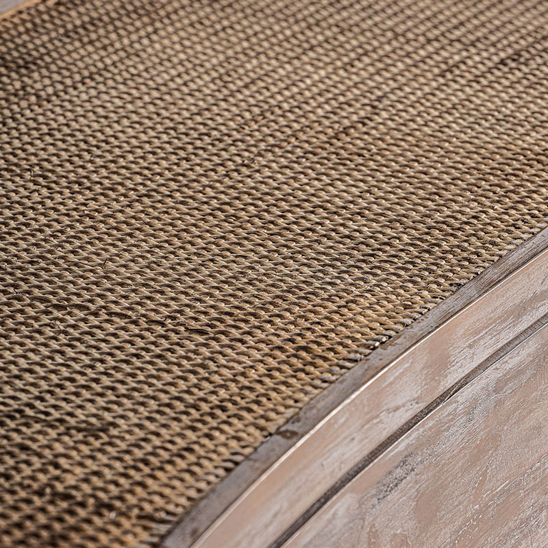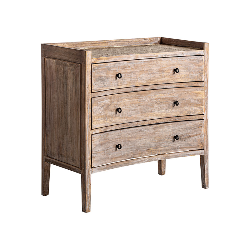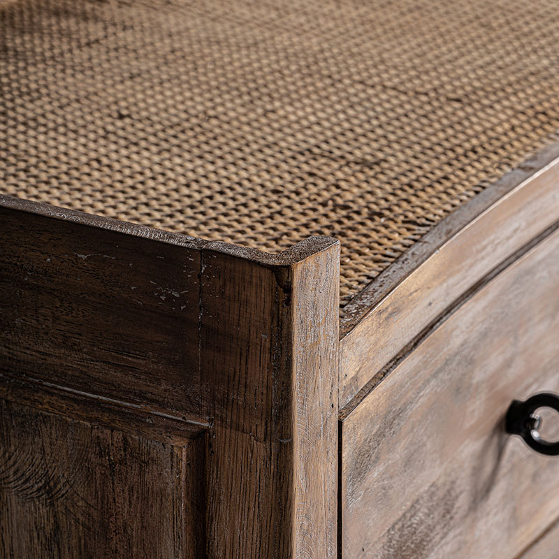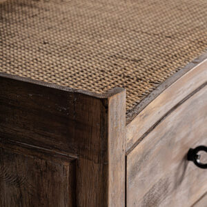 Cómoda lahn, en color blanco roto envejecido, de estilo provenzal. Fabricado en madera de abeto, combinado con ratán.