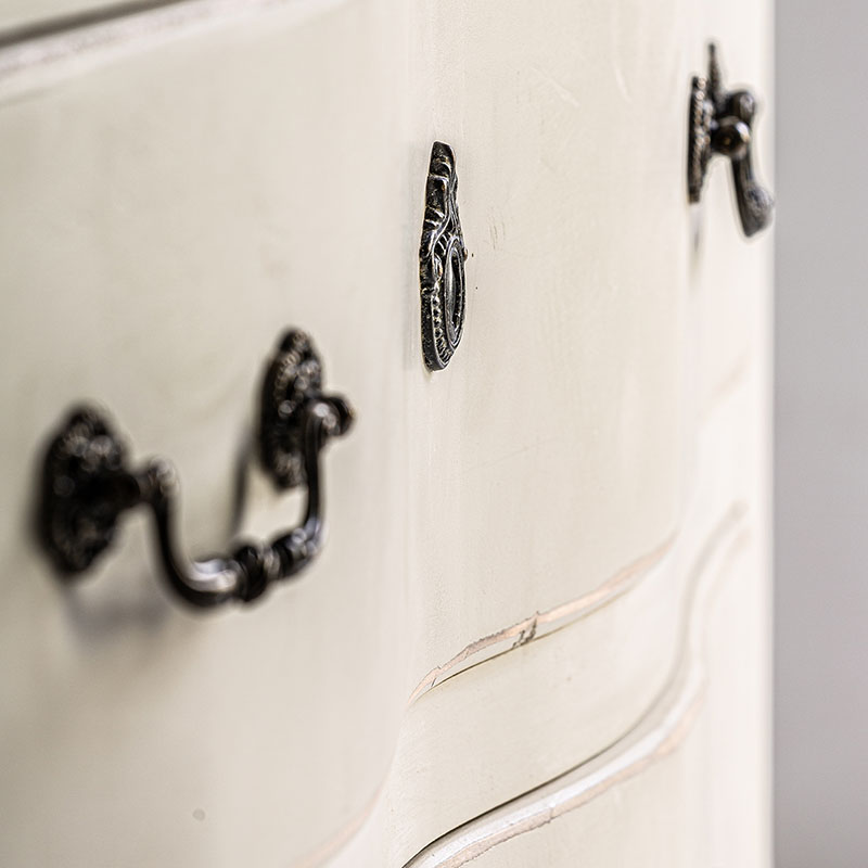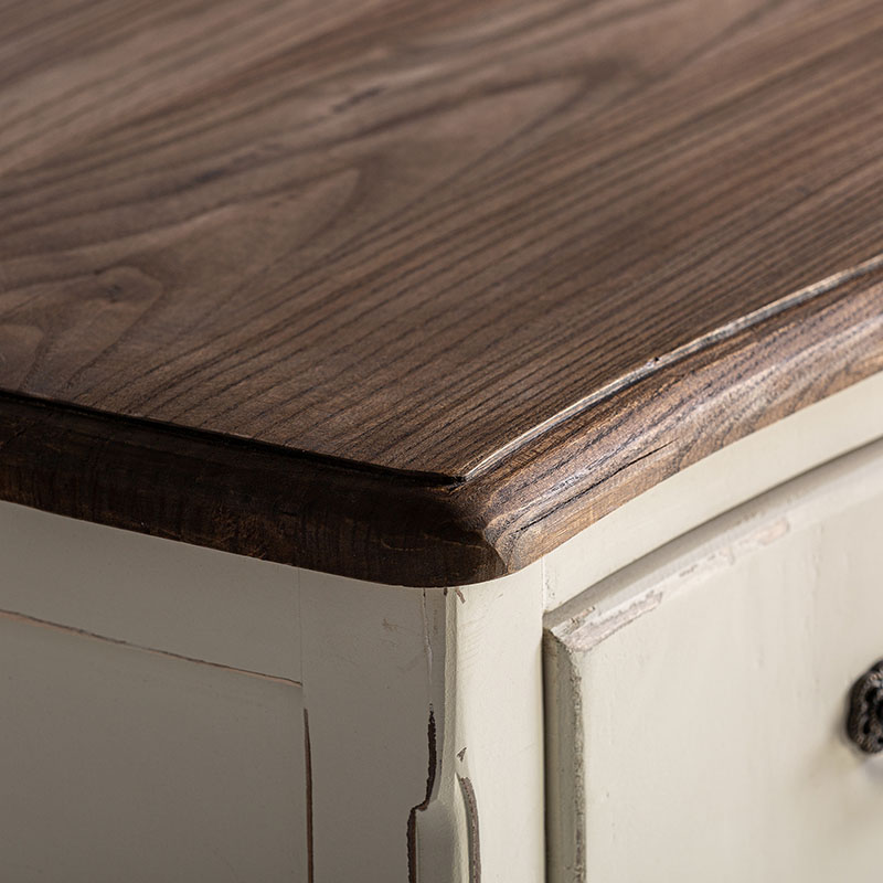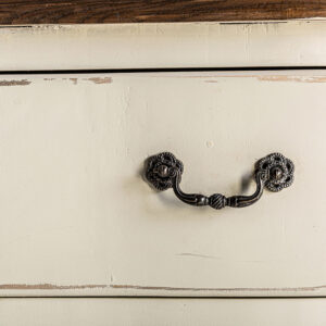 Cómoda Pivka de estilo provenzal fabricado en madera de pino en color blanco roto con acabado envejecido.