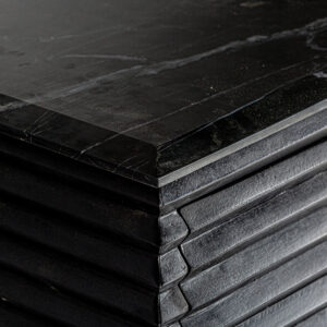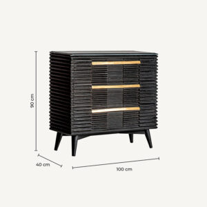 Cómoda plissé wood, en color negro, de estilo art deco. Fabricado en madera de mango, combinado con mármol mate y hierro. Producto desmontable.