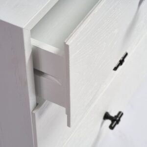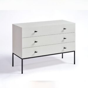 Cómoda con tres cajones acabada en madera de roble blanco con pata y tiradores en T de metal de tubo redondo negro mate. Una cómoda de líneas rectas y estilo minimalista. Se adapta perfectamente a estilos contemporáneos e incluso mediterrráneos. Una pieza con mucha clase y estilo. Cómoda para dormitorio con capacidad de almacenaje distribuida en 3 cajones con originales tiradores en forma de T en color negro.