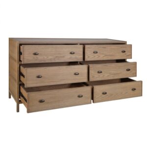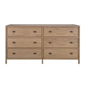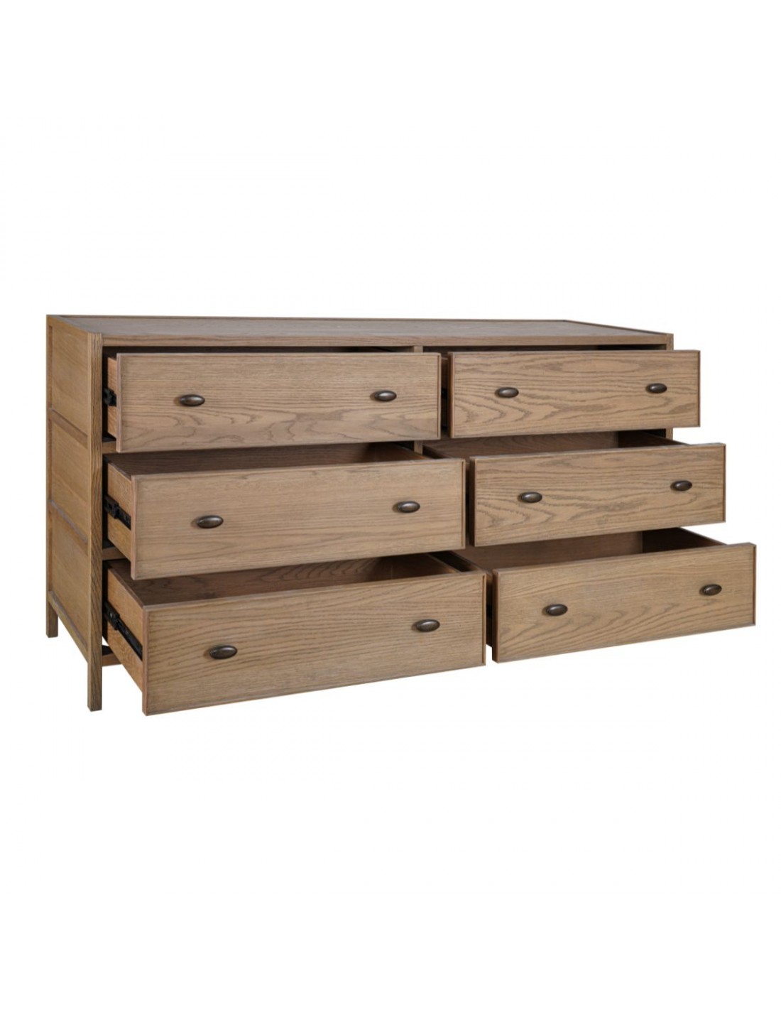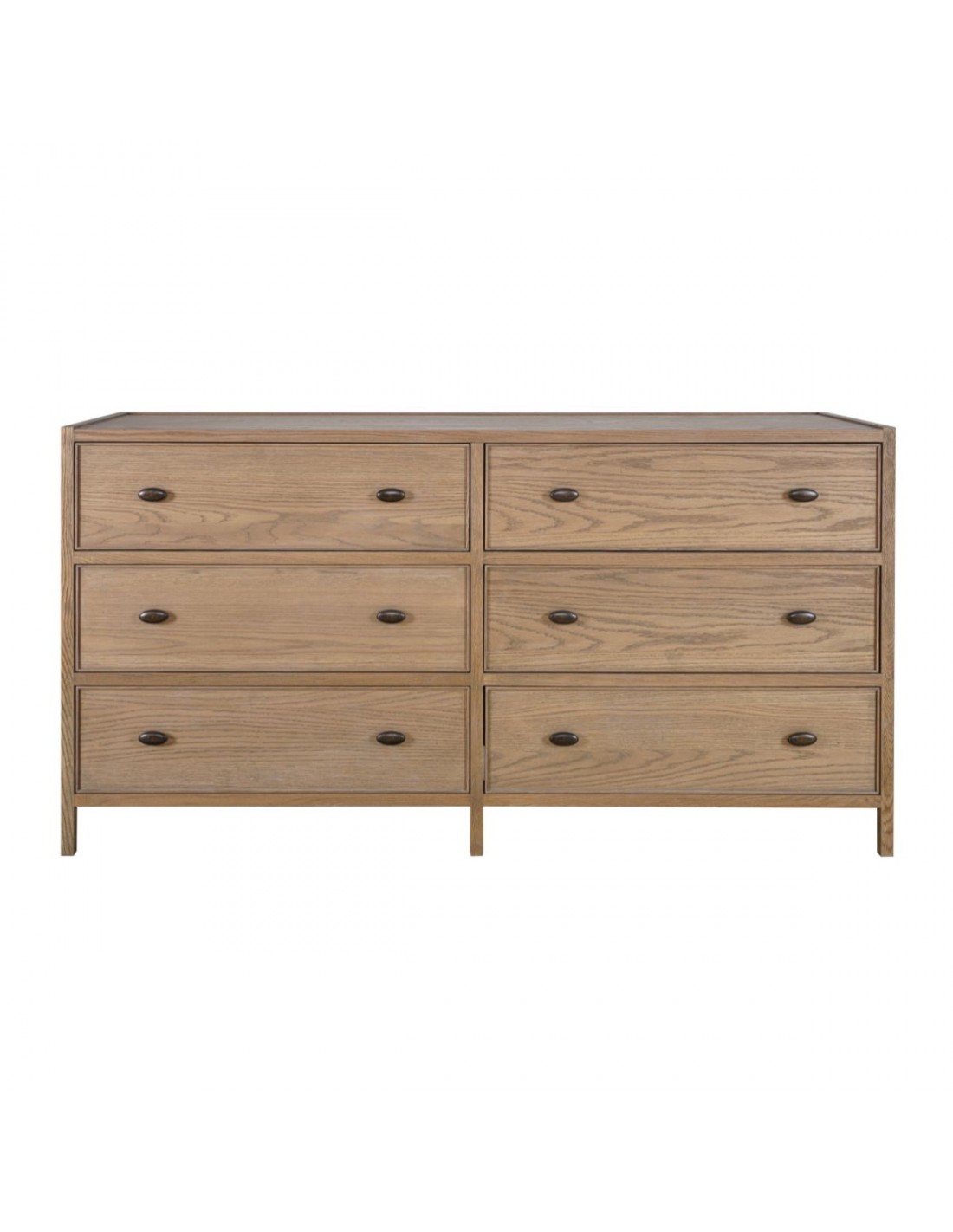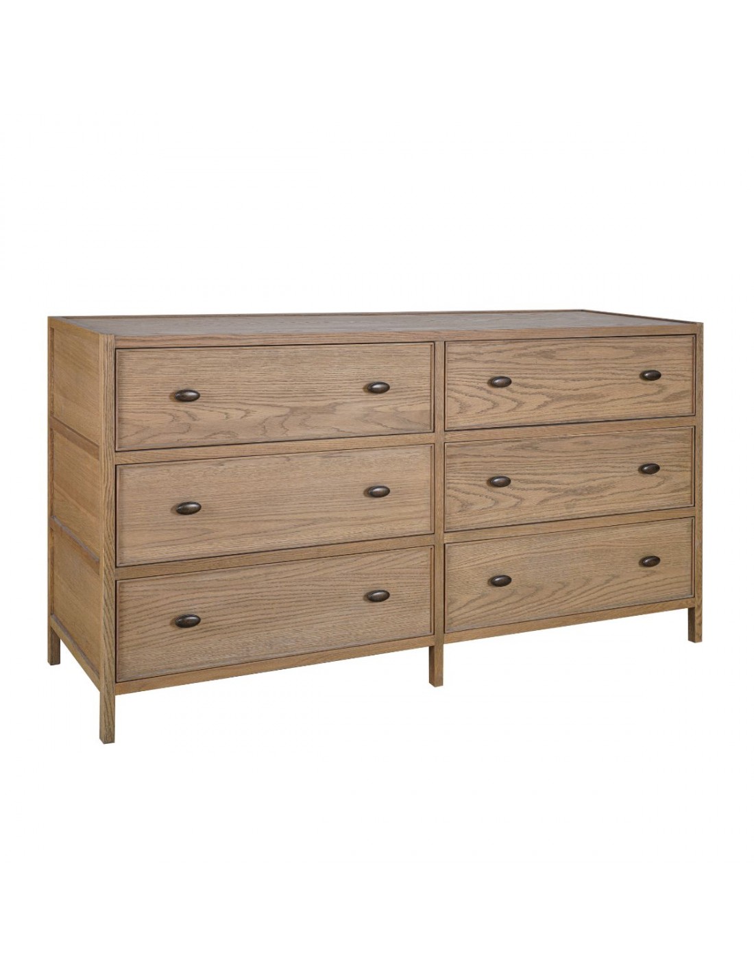 Cómoda acabada en madera de roble con 6 cajones con tiradores de metal. Una pieza perfecta para mantener en orden lus pertenencias en el dormitorio o zona de estar. De estilo minimalista con un toque colonial se adapta a cualquier ambiente. Disponible en otras medidas y acabados. Crea tu combinación perfecta.