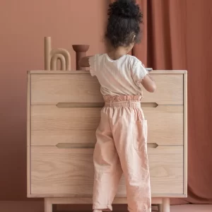 La Cómoda Pure de madera de roble es ideal para crear un ambiente ordenado y cálido. Es muy espaciosa y tiene 4 cajones de distintas medidas para organizar la ropa y los accesorios de tu bébé.
