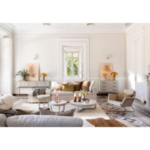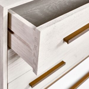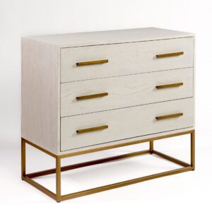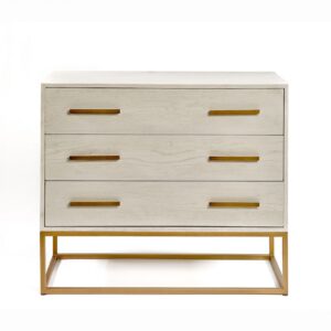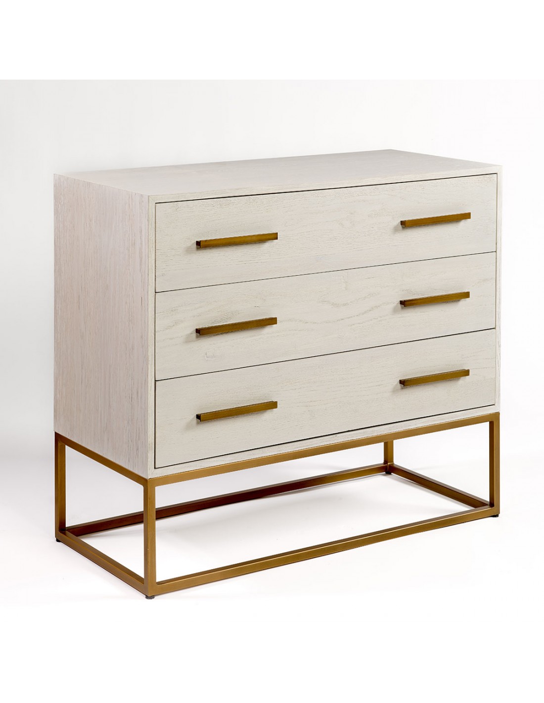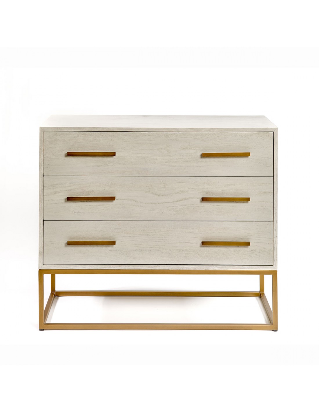 Cómoda con acabado en roble color blanco patinado grisáceo. Estructura base metálica dorada acabado efecto mate. Esta pieza cuenta con 3 cajones con gran capacidad de almacenaje. Combina a la perfección con el modelo ENRI-W como mesitas de noche, de la misma colección o la mesita ELLA también en blanco. Una elección elegante y única para un acabado limpio de última tendencia.