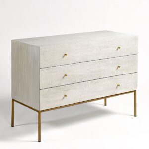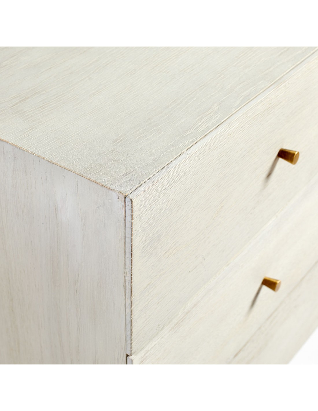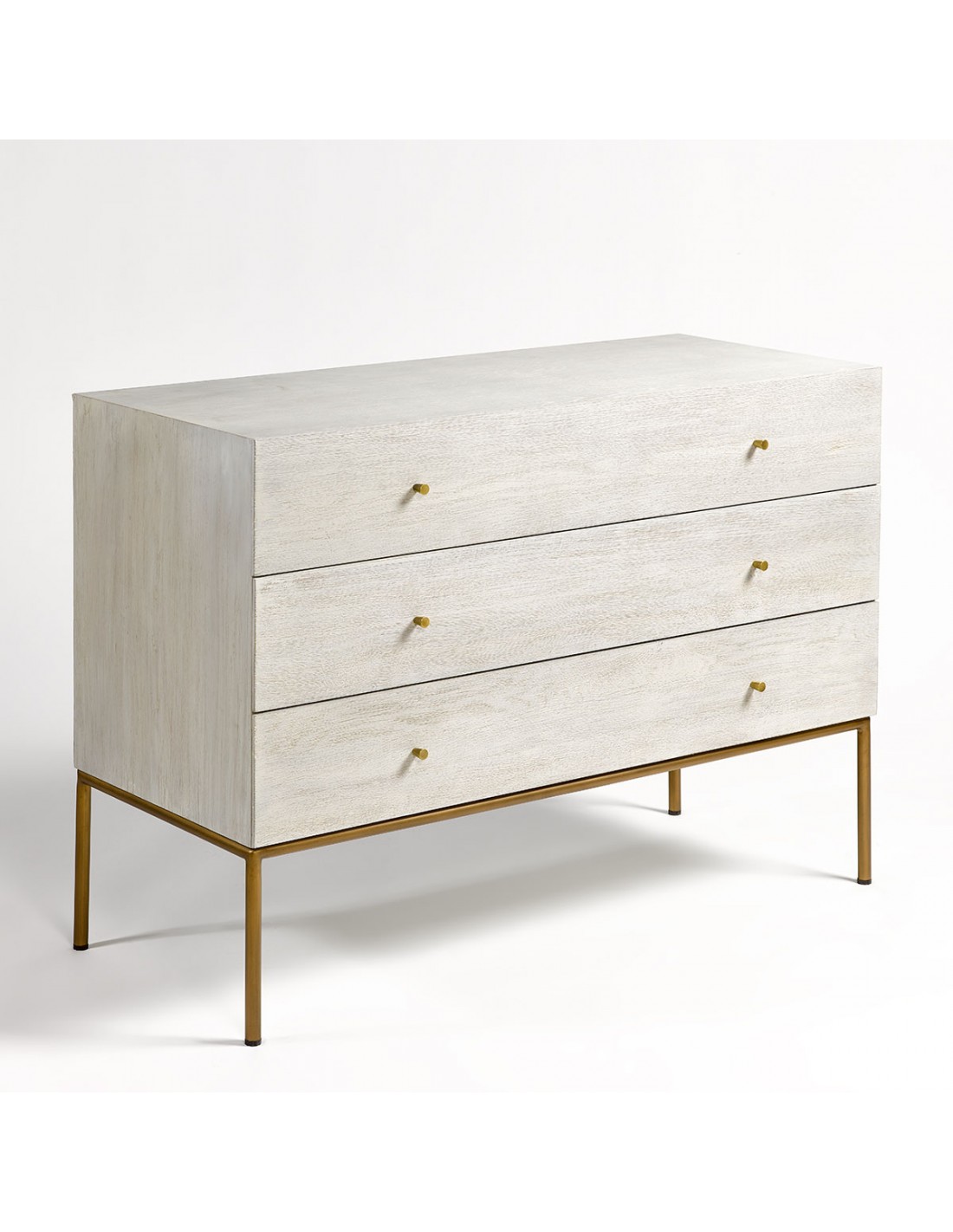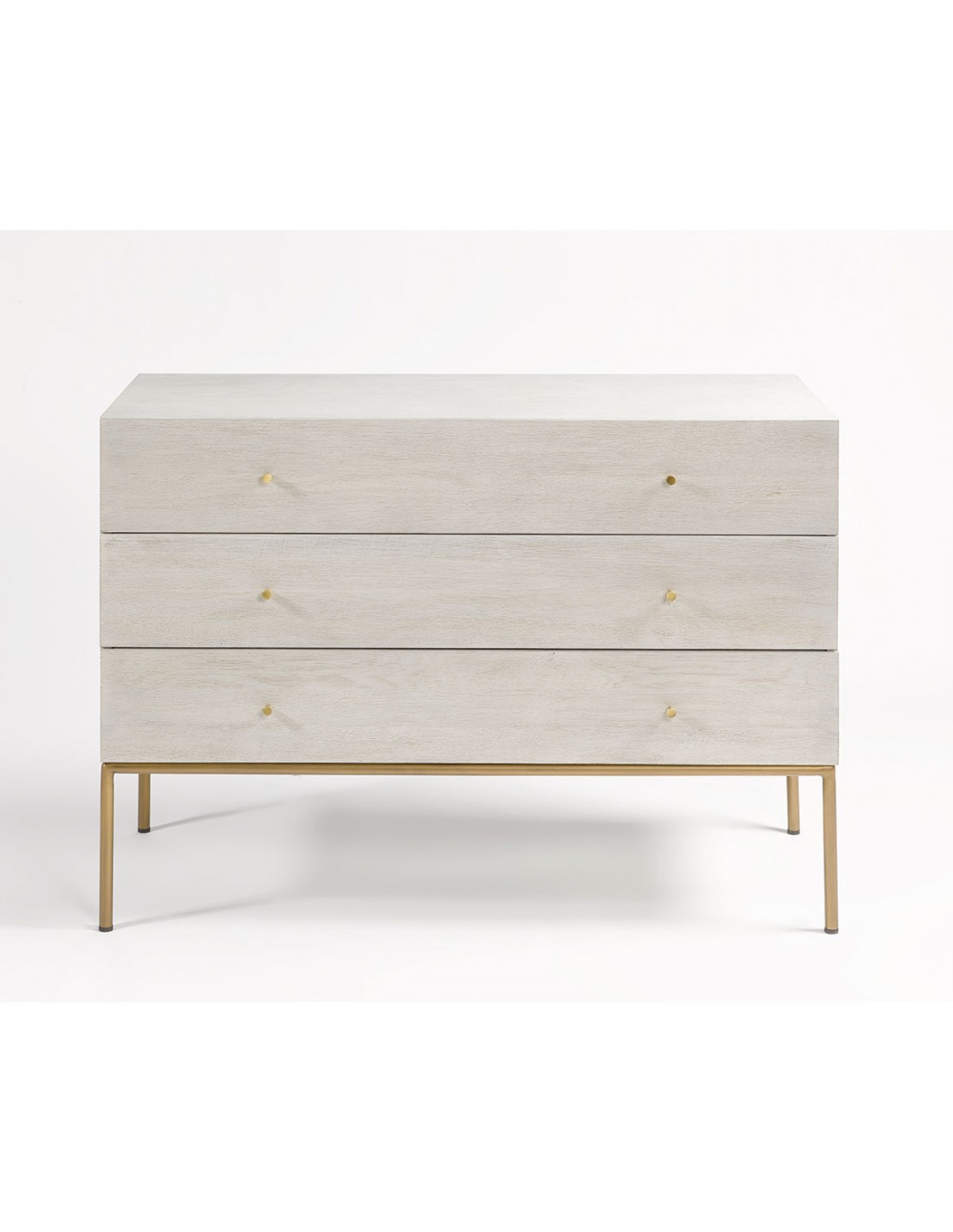 Cómoda con acabado de roble en tono blanco grisáceo patinado. Pata estructura metálica en color dorado envejecido. Cuenta con tres cajones para mayor almacenaje. Cómoda de diseño con líneas rectas y minimalista.
