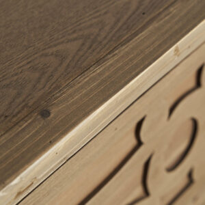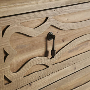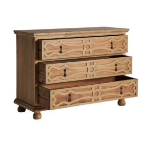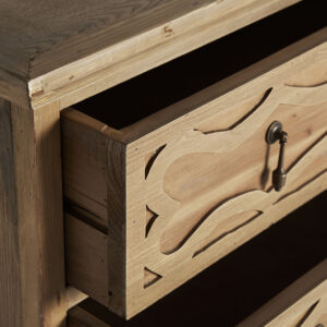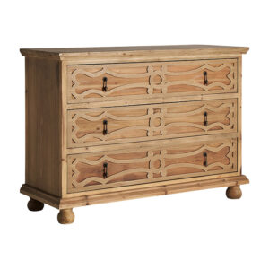 Cómoda Rumford de estilo colonial fabricado en madera de pino reciclado en color marrón.