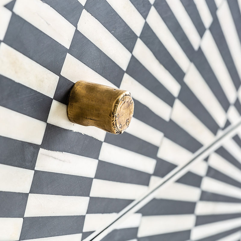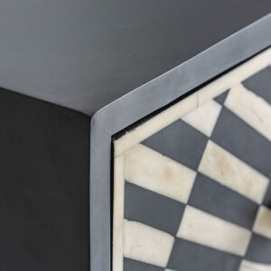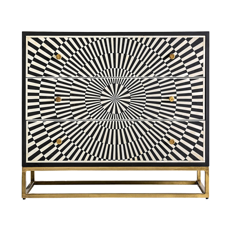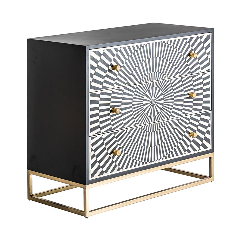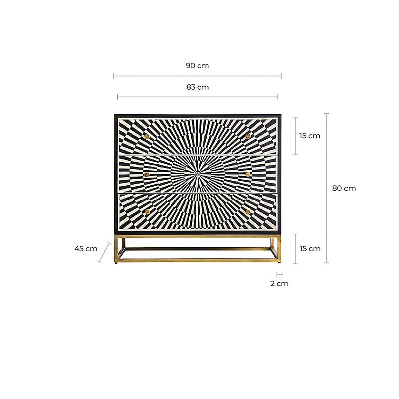 Cómoda rust, en color negro/oro, de estilo contemporáneo. Fabricado en hierro, combinado con madera dm y hueso.
