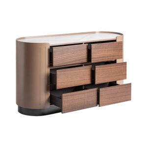 Cómoda Soaza de estilo contemporáneo fabricado en madera contrachapada en color marrón combinado con chapa de eucalipto en color marrón claro y piedra sinterizada en color blanco.