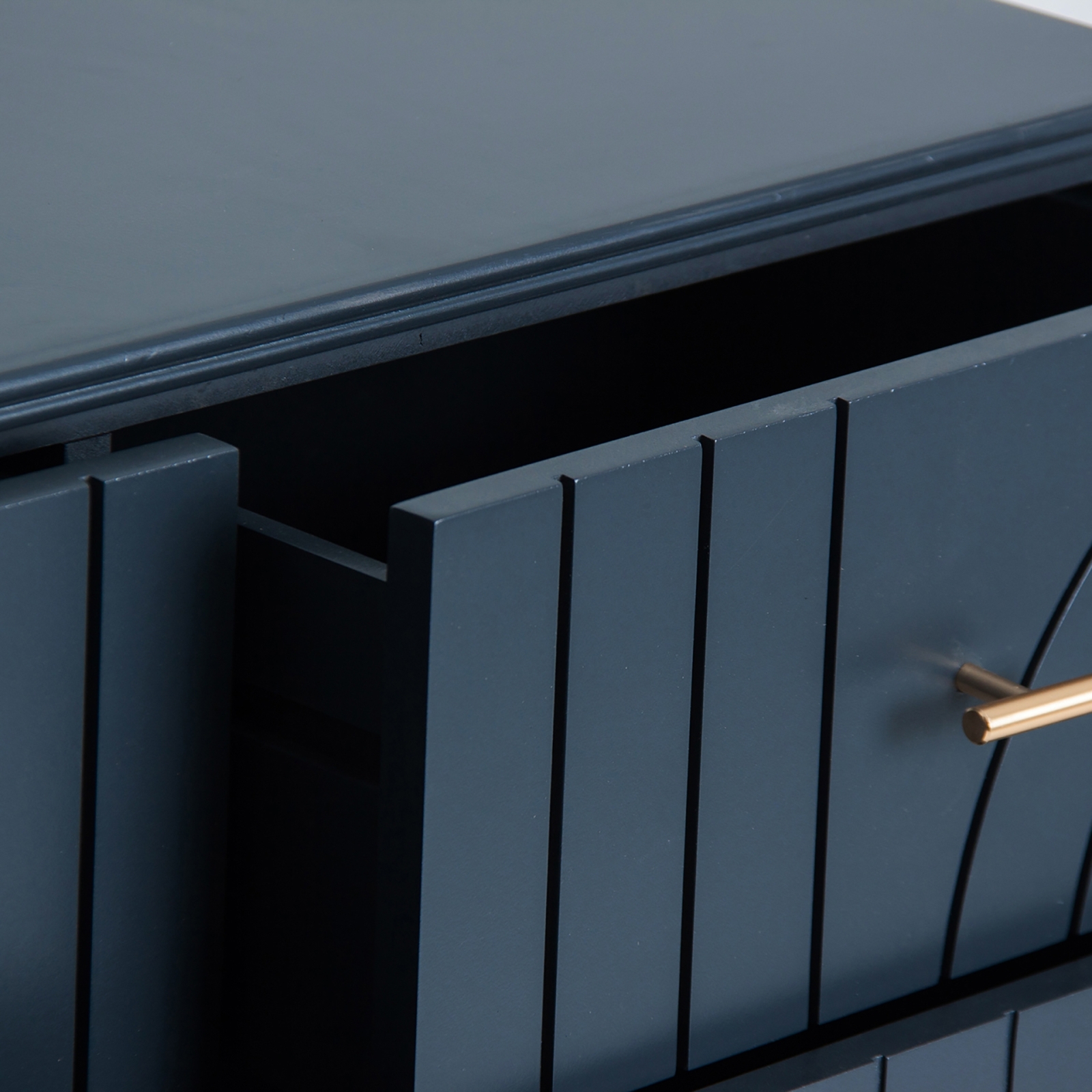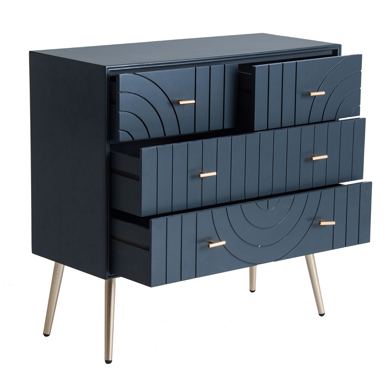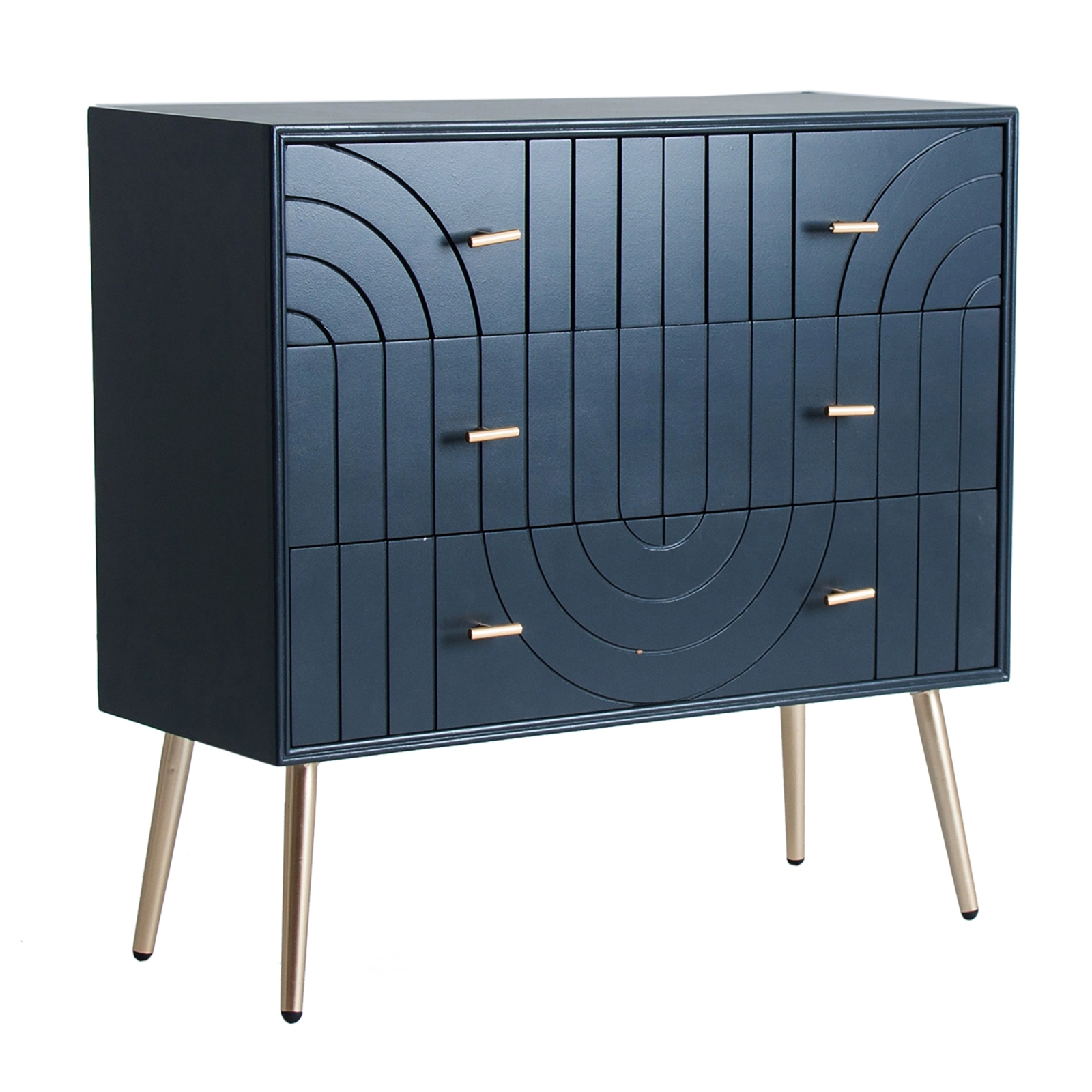 La cómoda Tremes de estilo contemporáneo, destaca por su estructura de madera de pino en color gris oscuro combinada con patas y tiradores con un acabado en un elegante color dorado. Posee tres cajones con un sencillo patrón geométrico, la cual cosa la convierte en una pieza elegante y perfecta para cualquier dormitorio. Su medida es de 80X35X78 cm.