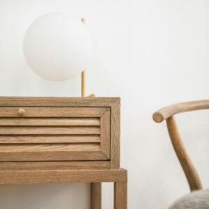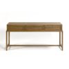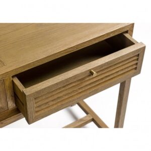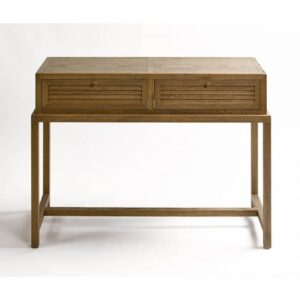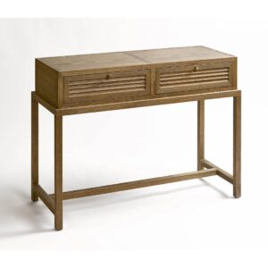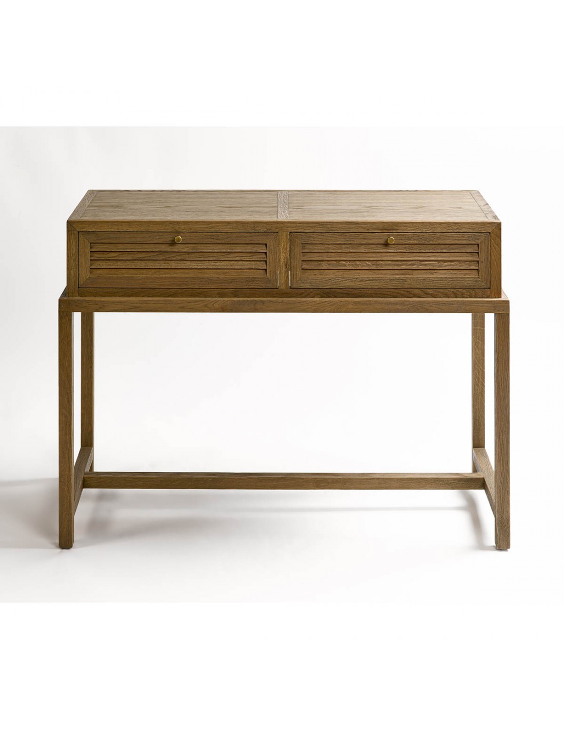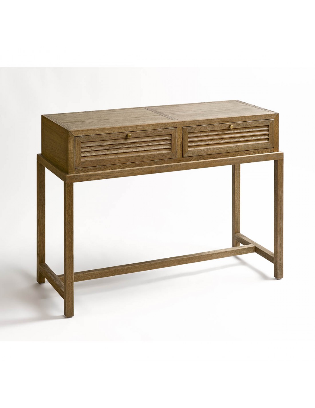 Consola de madera acabado en roble con dos cajones. Color natural. Presenta un frontal con persianilla y estructura base también en madera.