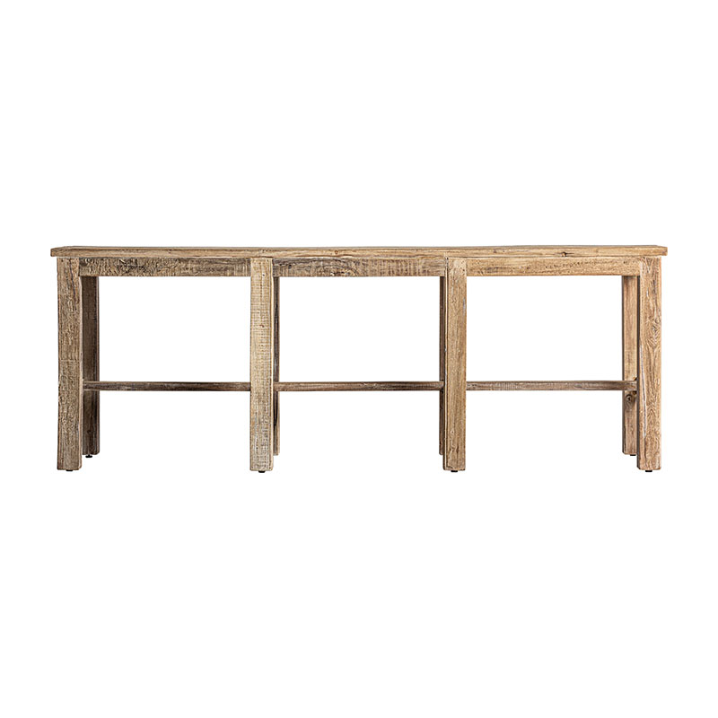 Consola carrik de estilo colonial fabricado en madera recuperada en color marrón.