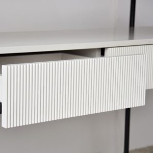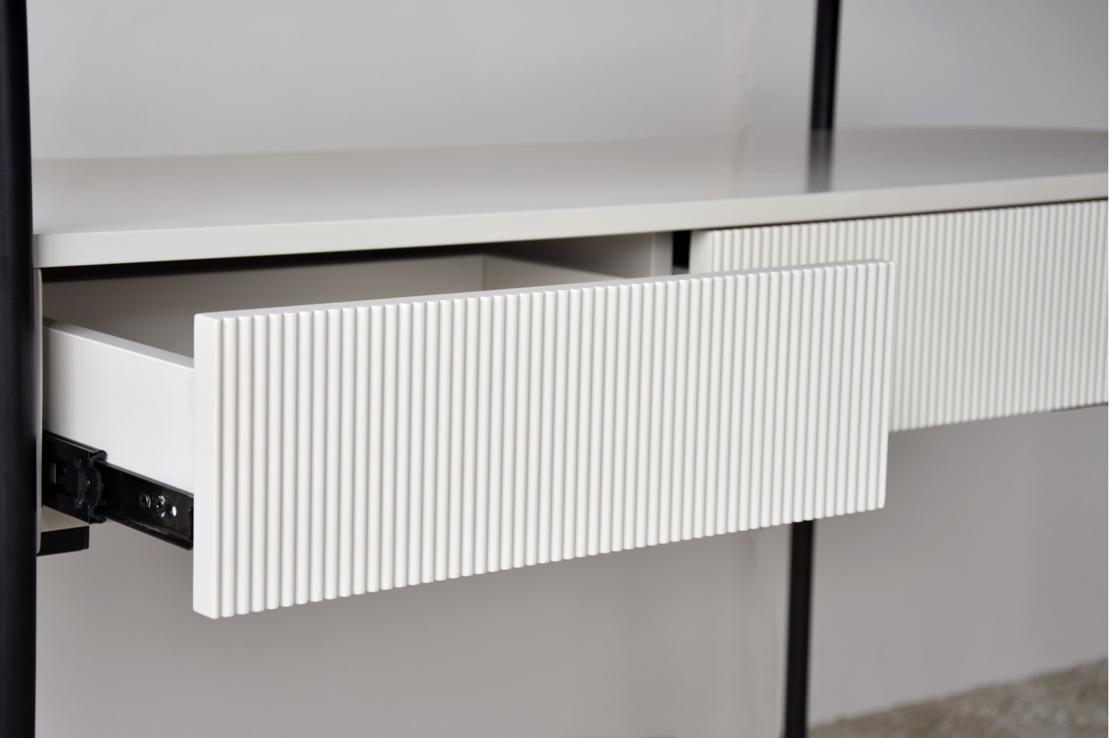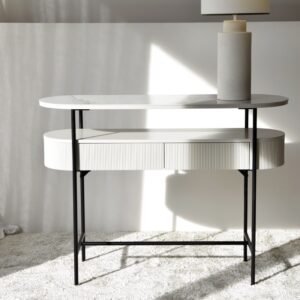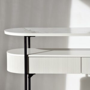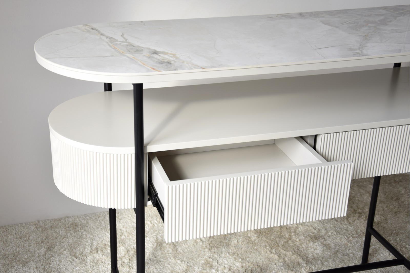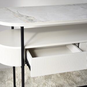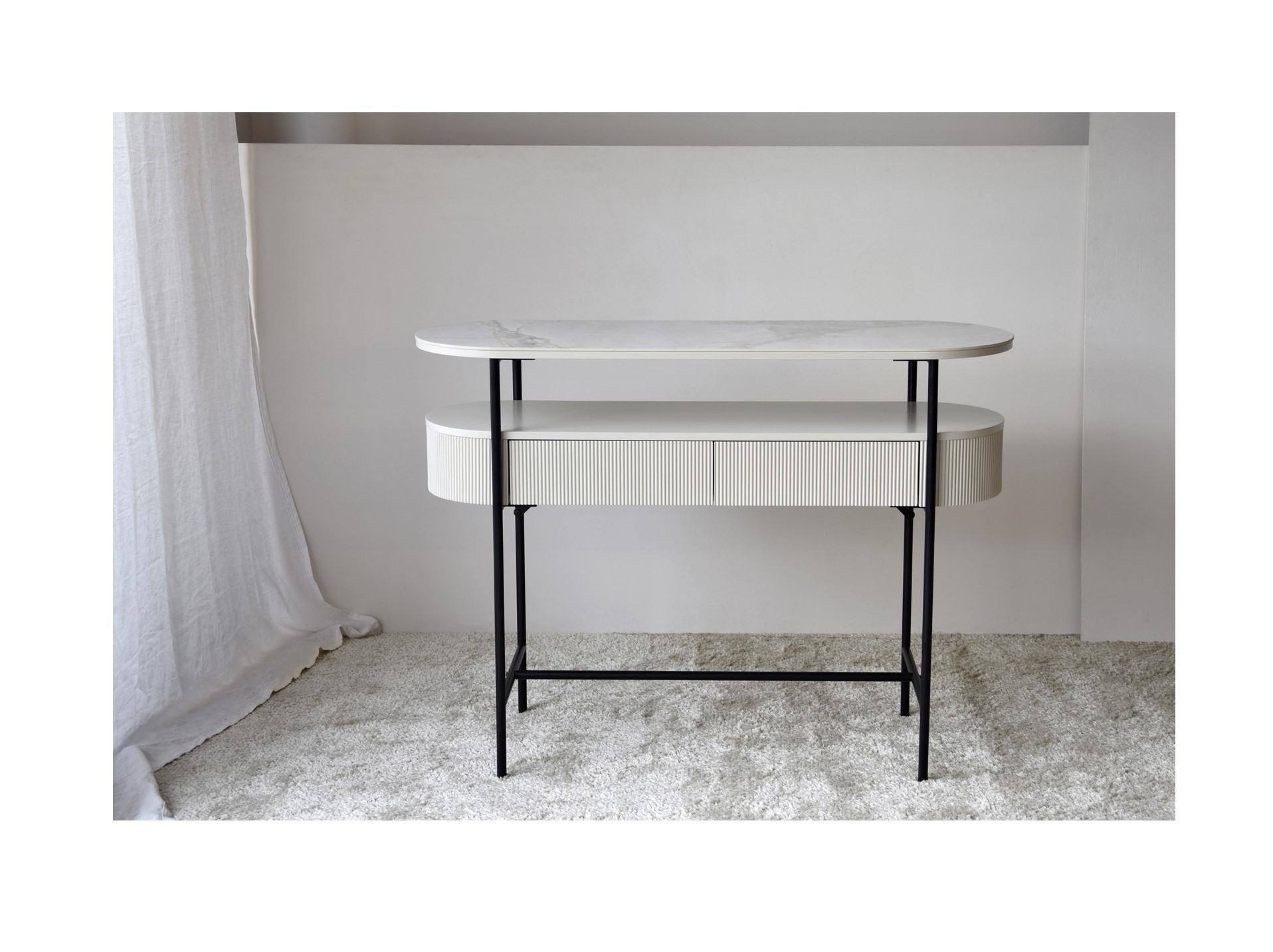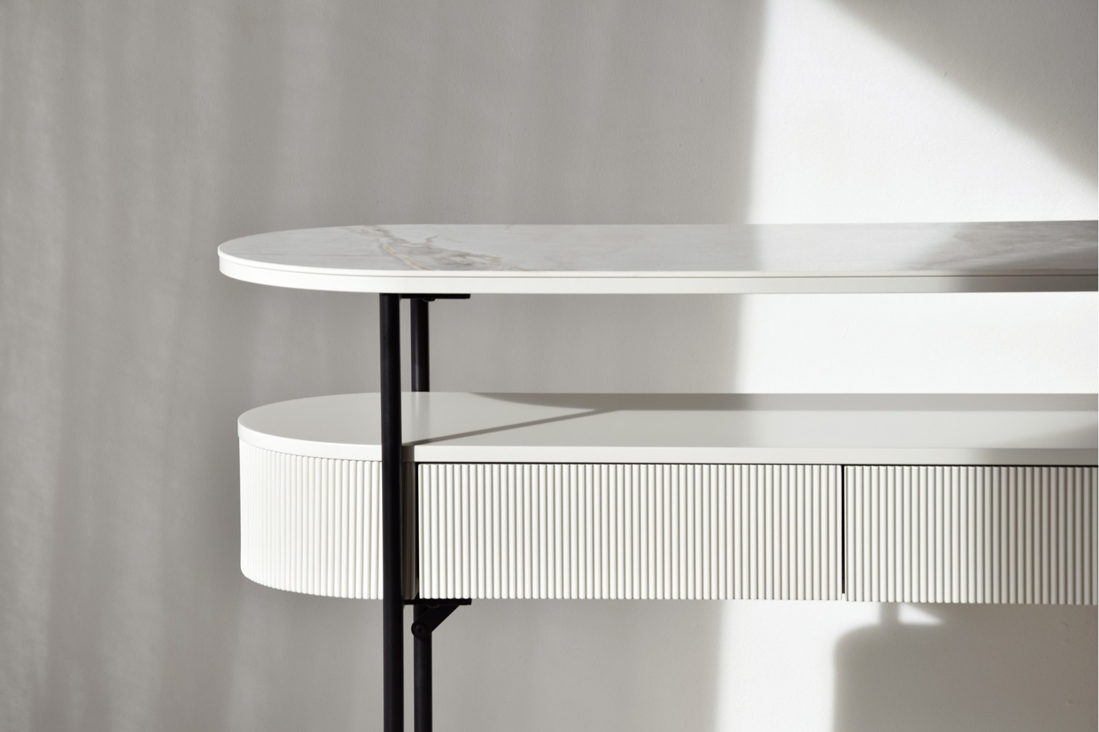 CONSOLA N.24. DE DISEÑO OVAL ESTA CONSOLA CUENTA CON UNA ESTRUCTURA METÁLICA DE COLOR NEGRO Y ACABADO MATE QUE PONE EL CONTRAPUNTO A LOS TONOS ESCOGIDOS PARA EL TABLERO EN MÁRMOL CERÁMICO BLANCO Y GRIS SUAVE Y PARA EL CUERPO DE LA PIEZA REALIZADO EN TABLERO DM CON DISEÑO ACANALADO Y LACADO EN UN CÁLIDO GRIS ARENA DE ACABADO MATE. CUENTA CON UN CAJÓN.