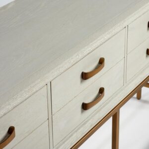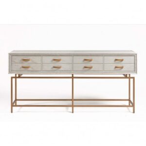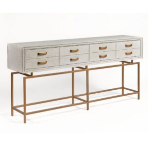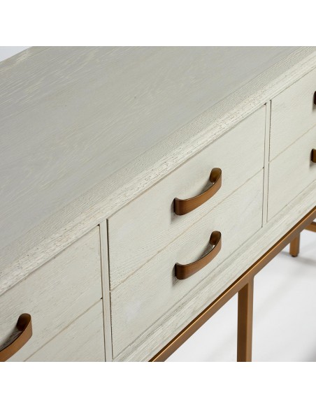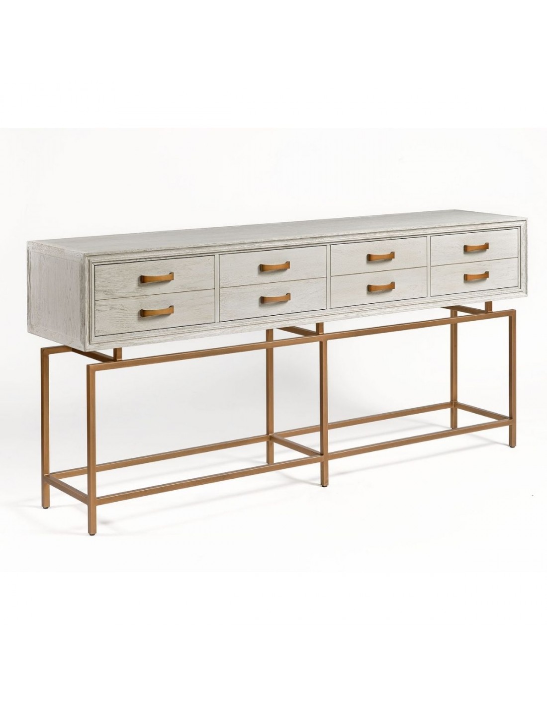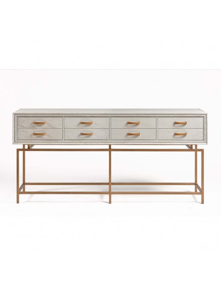 Consola acabada en madera de roble blanco / grisáceo y pata de metal dorada. En la parte frontal presenta 4 cajones. Cada cajón presenta 2 tiradores. Es una pieza ligera pero muy práctica por sus alta capacidad de almacenaje para las zonas de recibidor o distribuidor del hogar. Perfecta para uso en salón, comedor, distribuidor o zonas de entrada o paso. Destaca especialmente por el acabado de su color sofisticado y original.