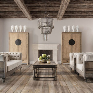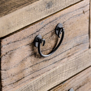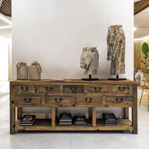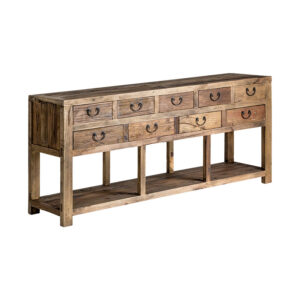 Consola ikast de estilo colonial fabricado en madera de pino reciclado en color marrón con acabado envejecido.