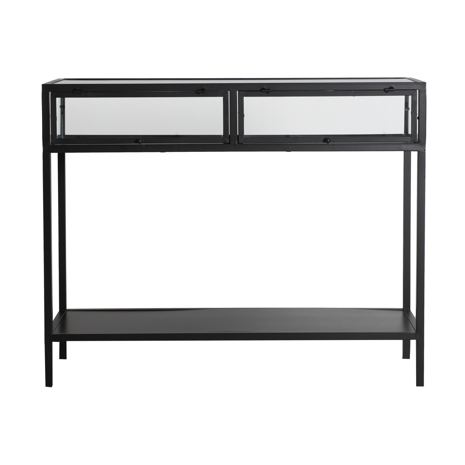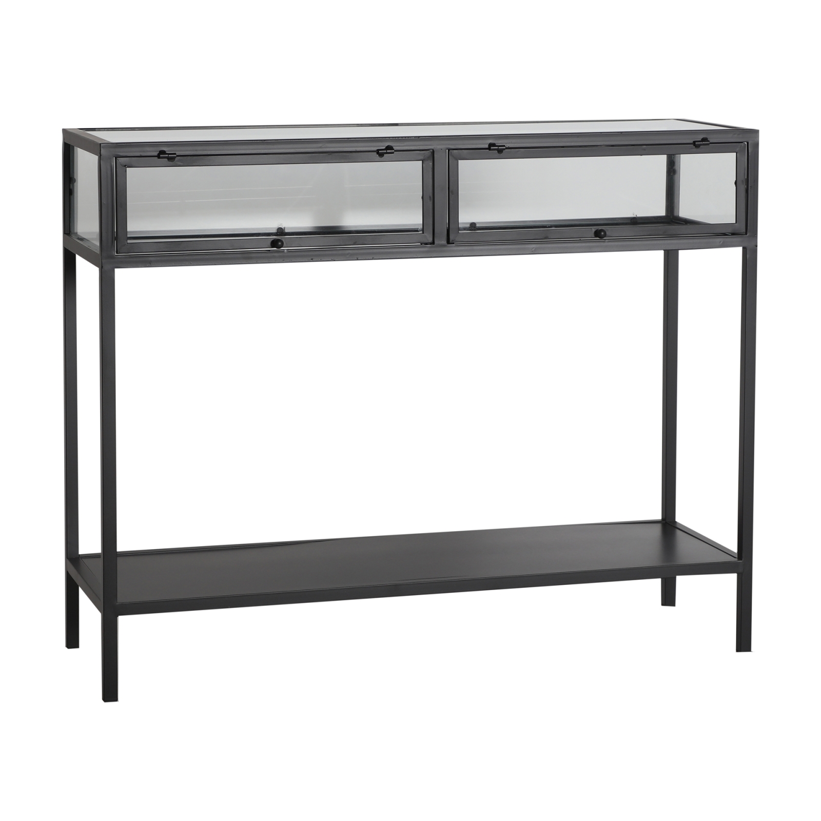 Consola kilrea, en color negro, de estilo industrial. Fabricado en hierro, combinado con vidrio. 100 ANCHO X 35 FONDO X 80 ALTO