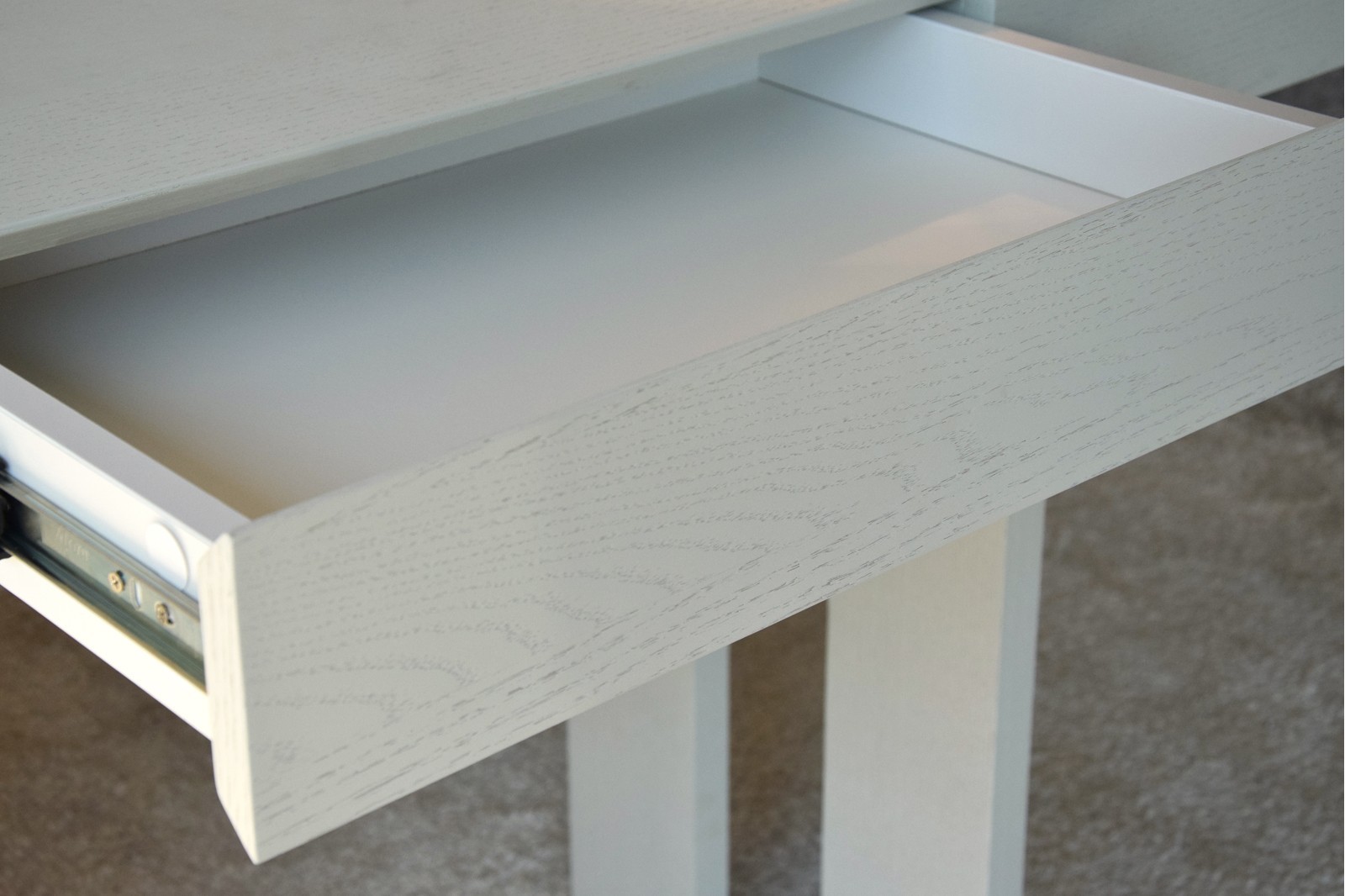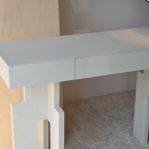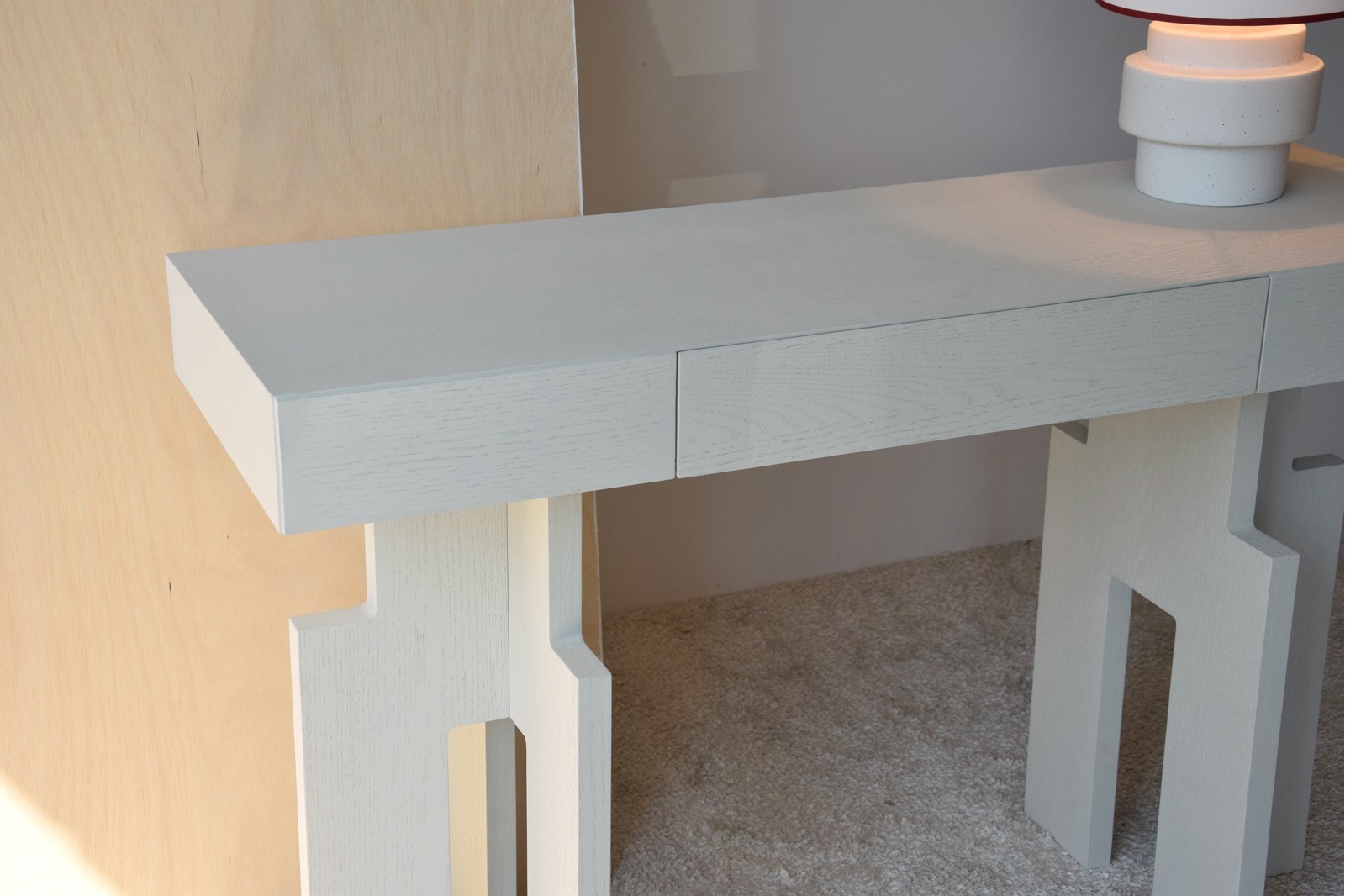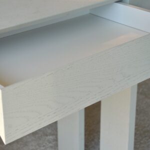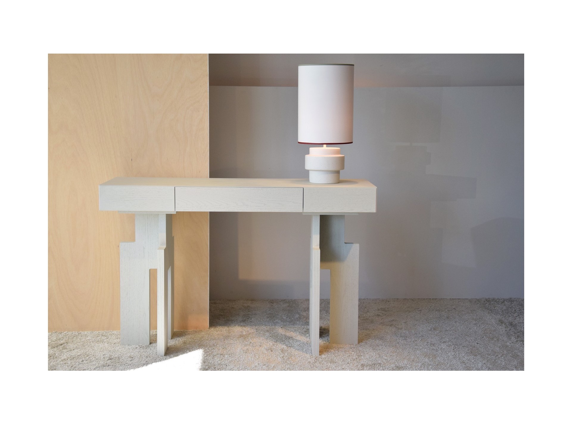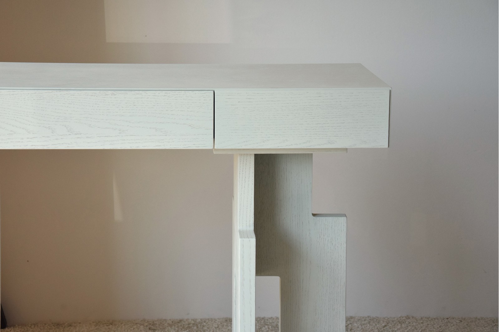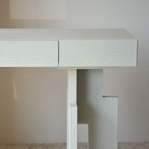 CONSOLA DE FORMAS ESCULTÓRICAS REALIZADA EN DM RECHAPADO EN MADERA ROBLE NATURAL TEÑIDO EN UN TONO BLANCO ROTO MATE QUE DEJA A LA VISTA LA VETA NATURAL DE LA MADERA. CUENTA CON UN PRÁCTICO CAJÓN CENTRAL.