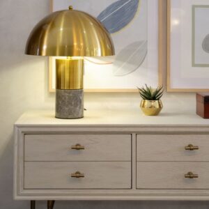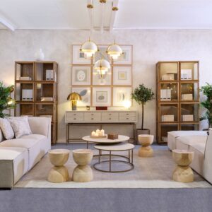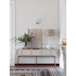 Consola glees de estilo art deco fabricado en madera de mango en color crema combinado con hierro en color oro y latón. Producto desmontable.