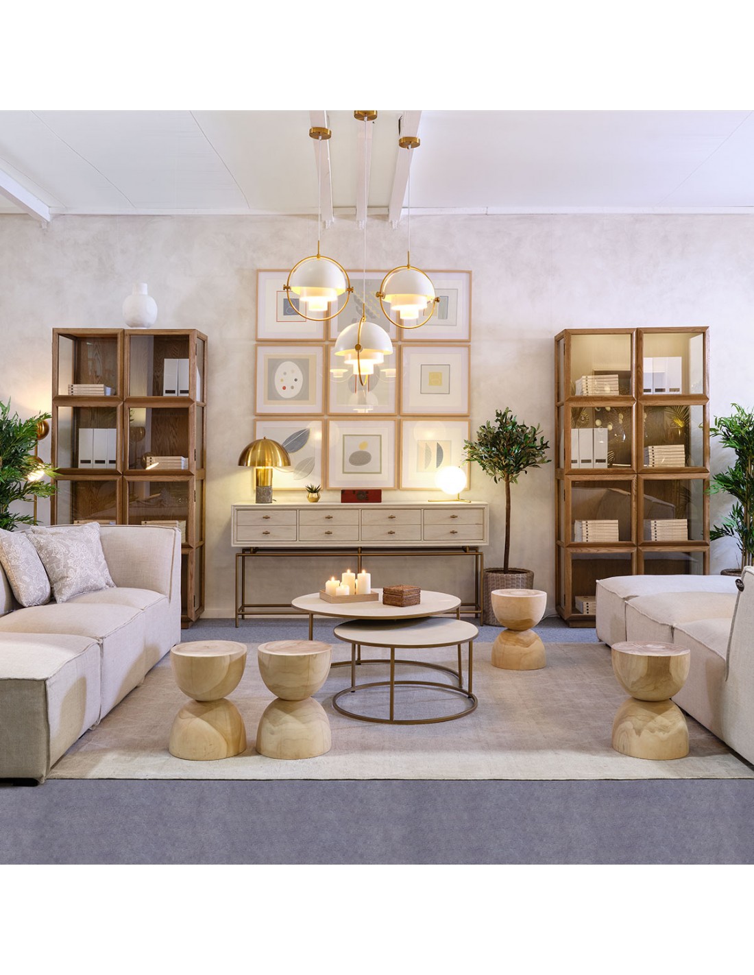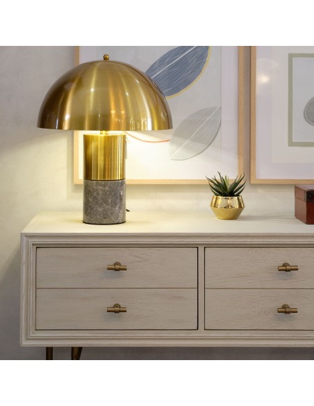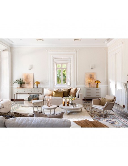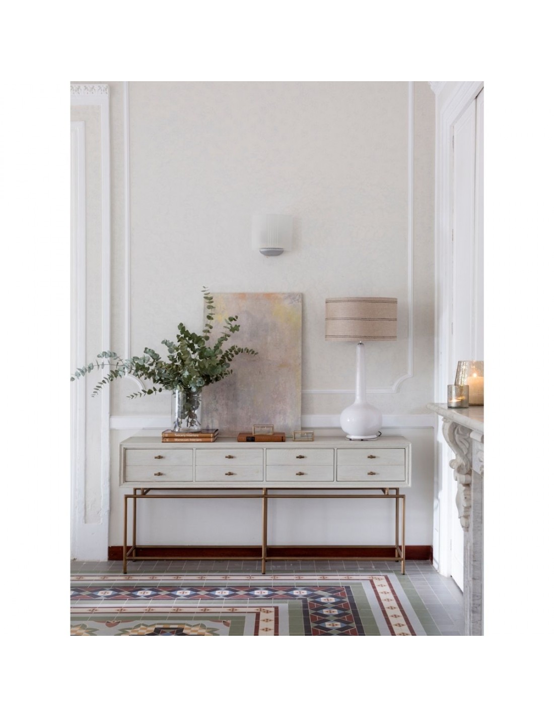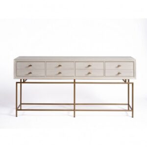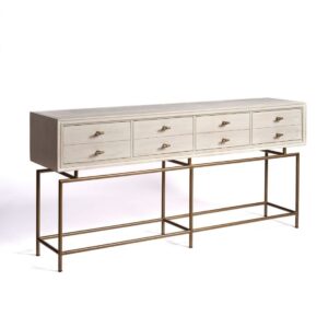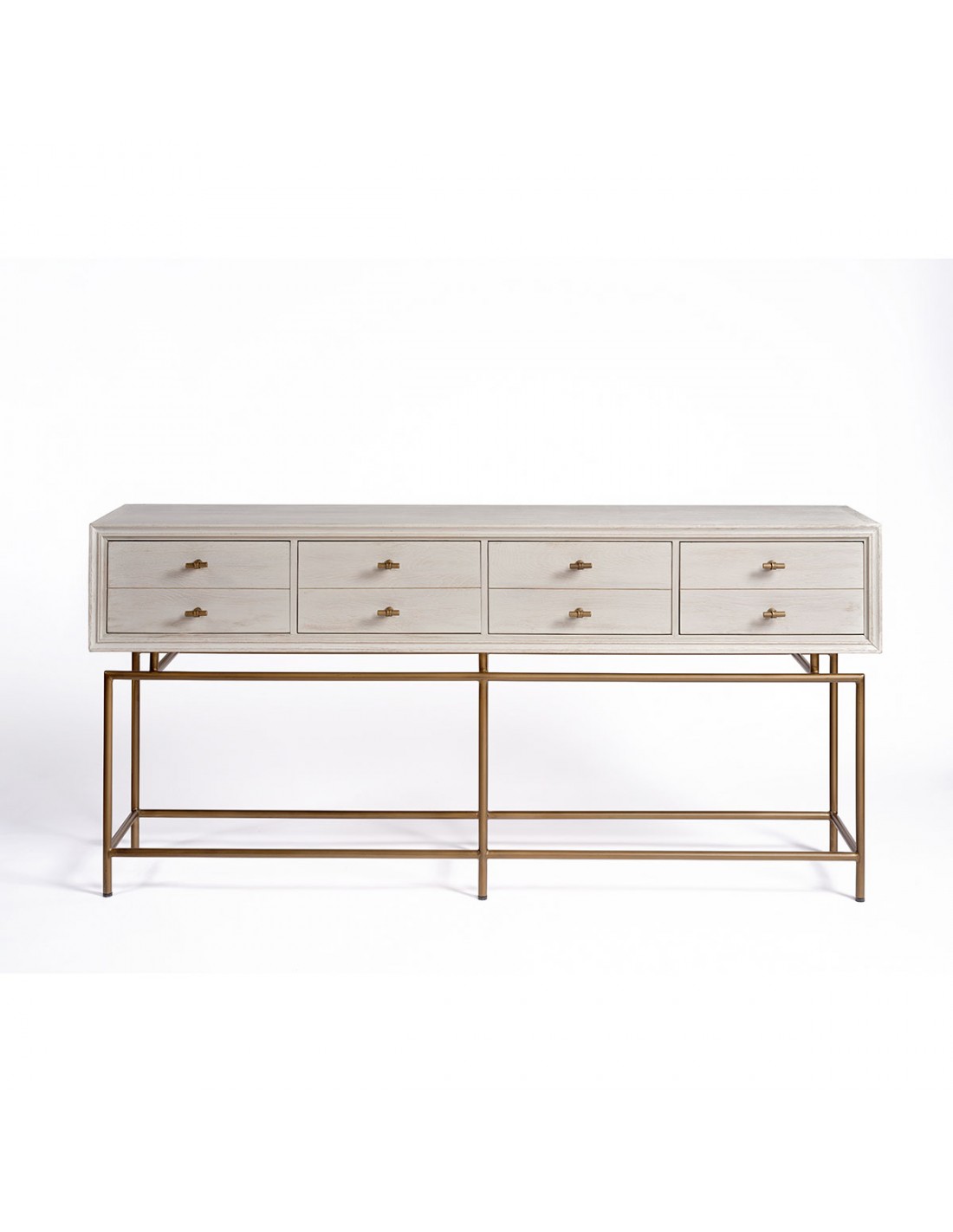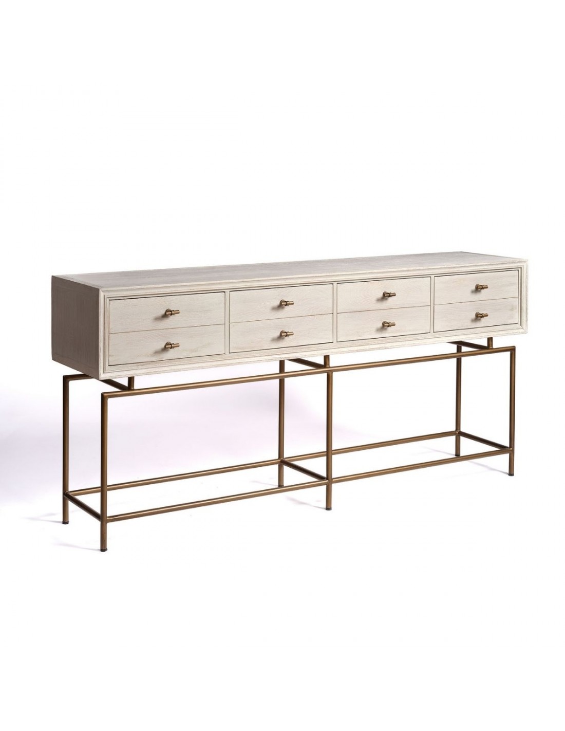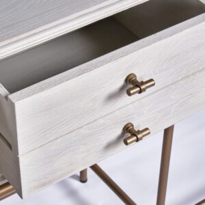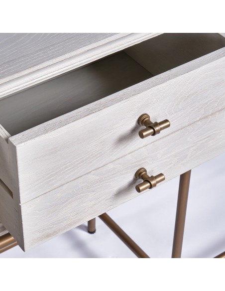 Consola con cajones de madera y metal. Consola acabada en roble blanco grisáceo con estrucutra metálica y tirador en forma de «T» en color dorado envejecido. Cuenta con 4 cajones cuyo frontal simula tener cajones separados. Estructura de metal con tubo redondo.