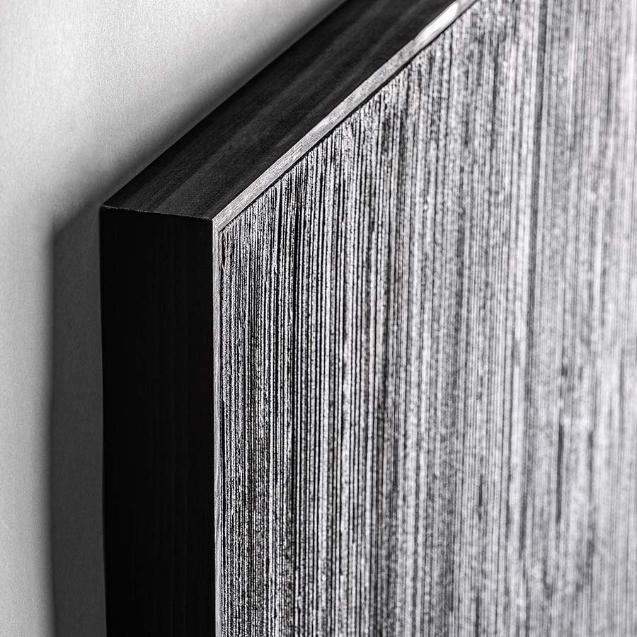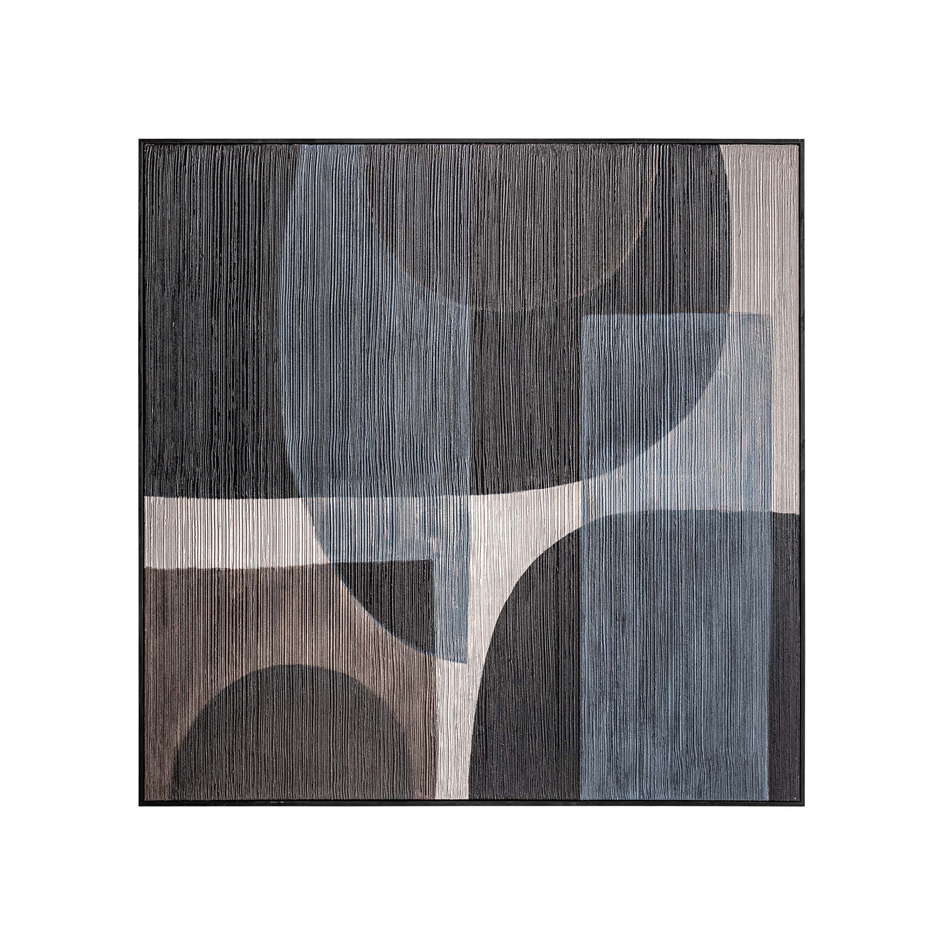 Cuadro Bobby de estilo contemporáneo fabricado en lienzo en color tonos de azul con acabado artesanal combinado con madera de pino en color negro.
