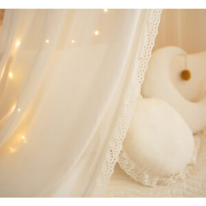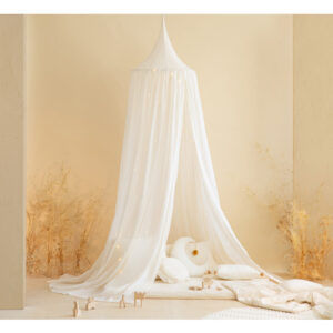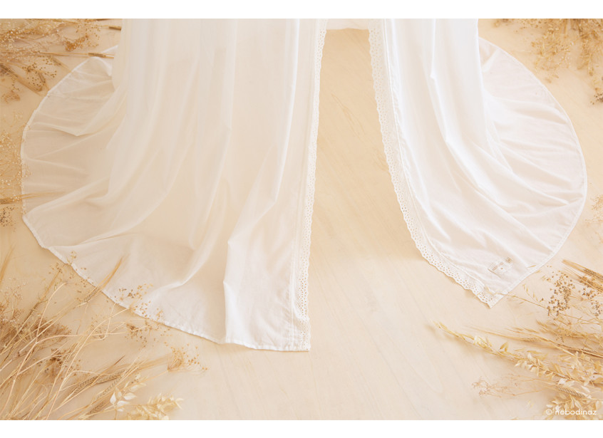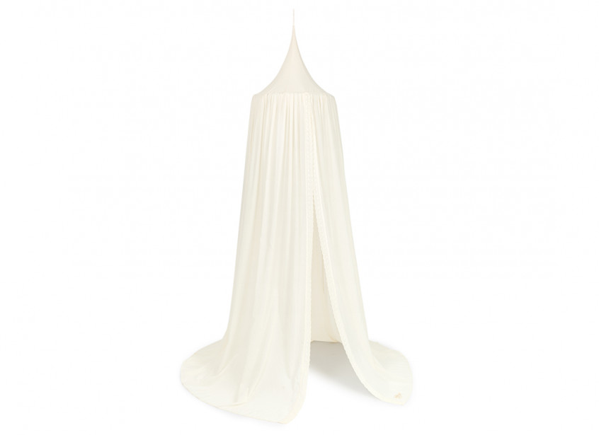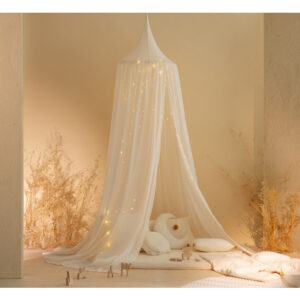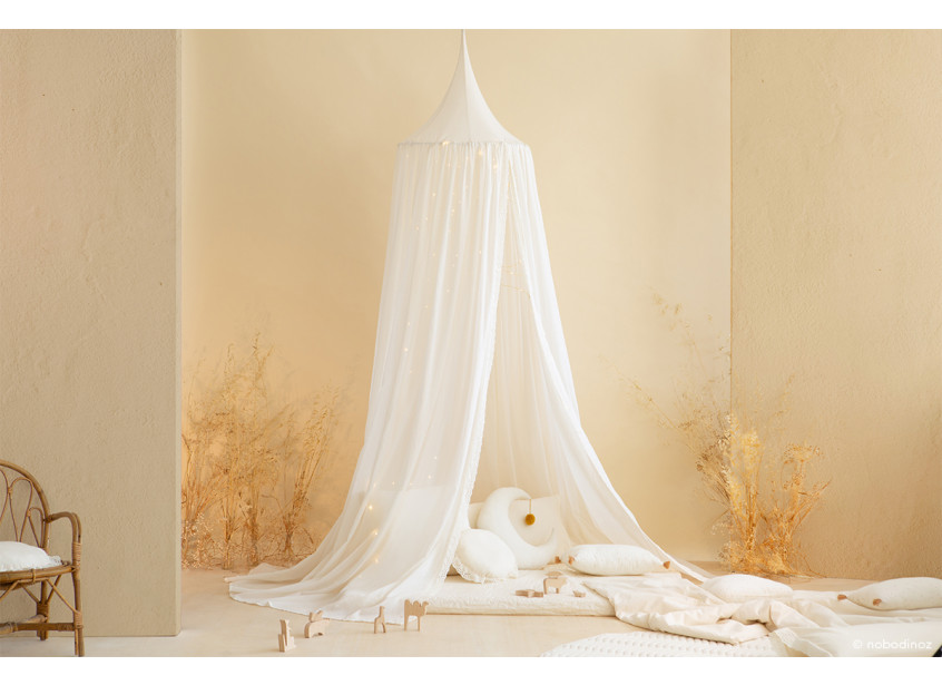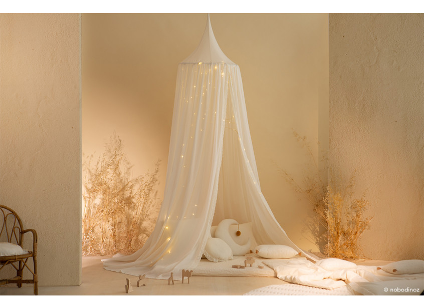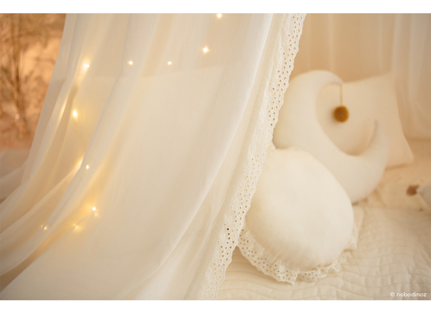 Nuestro dosel de cama VERA, en voile de algodón, decorado con delicados encajes, aporta un toque de poesía y ligereza al dormitorio de su hijo.