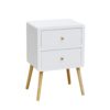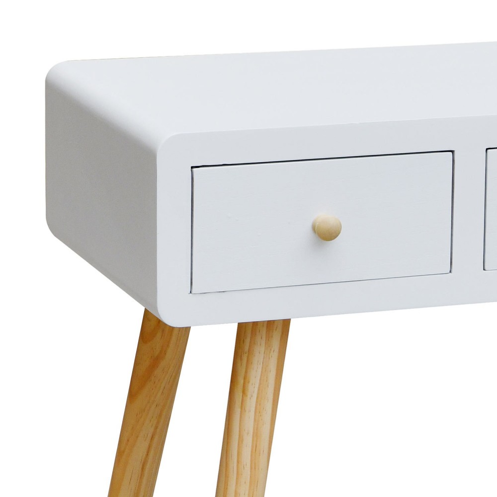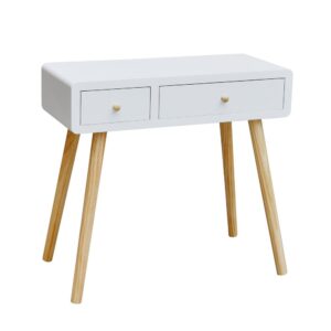 Mesa de escritorio fabricada en MDF color blanco y patas de pino en color natural.