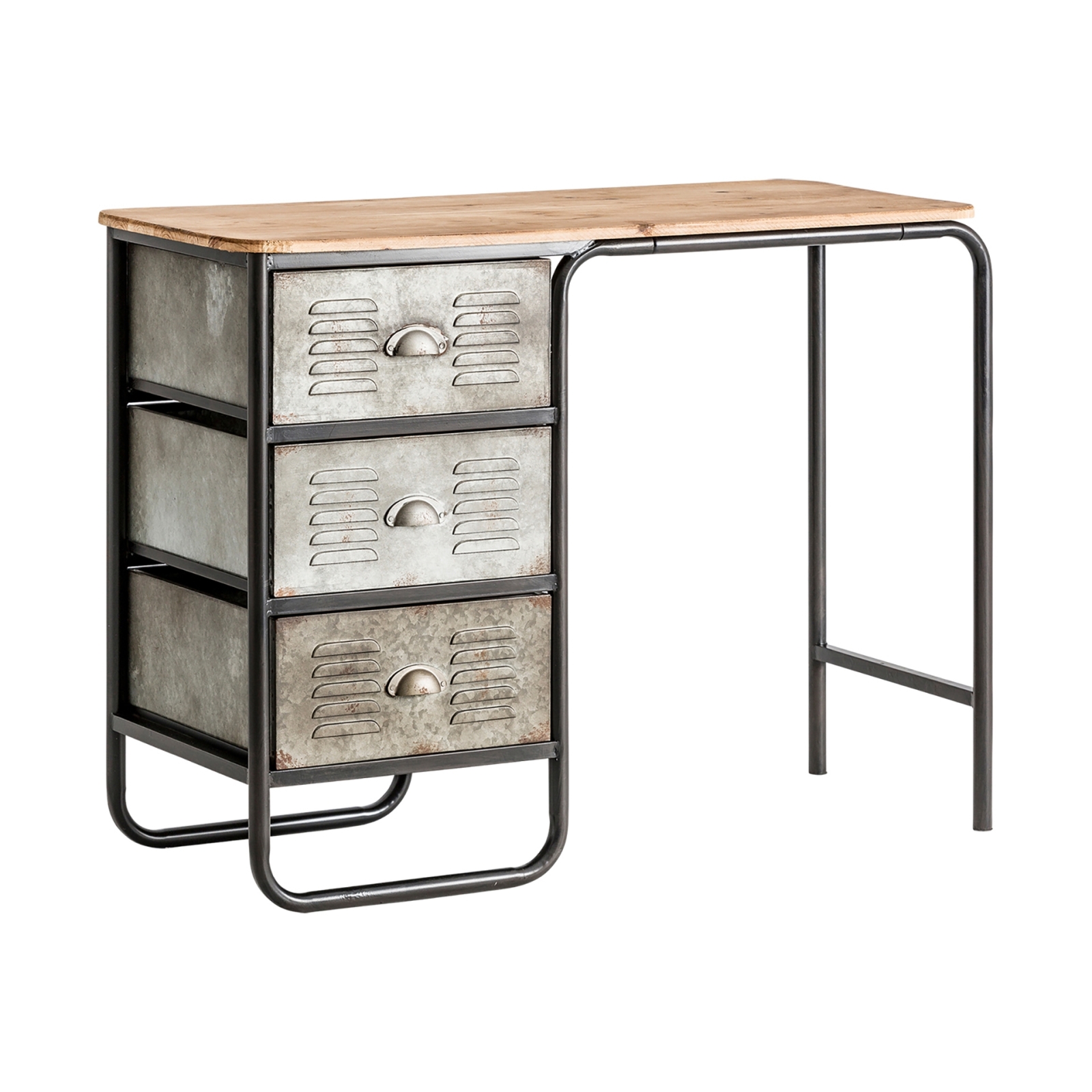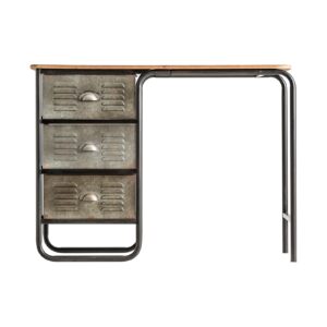 Escritorio de estilo idustrial elaborado en metal color gris y tablero de madera de abeto en color natural. Se trata de una pieza novedosa y versátil, perfecta para la oficina. El tablero de madera puede soportar hasta 70Kg de peso ya que se trata de un material resistente. Posee 3 cajones en la parte izquierda de 36x39x17cm. Además es una pieza desmontable, la cual cosa facilita su transporte y manejo.