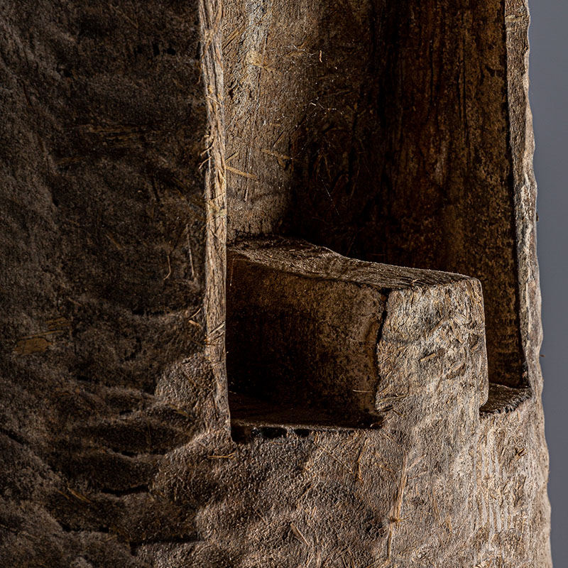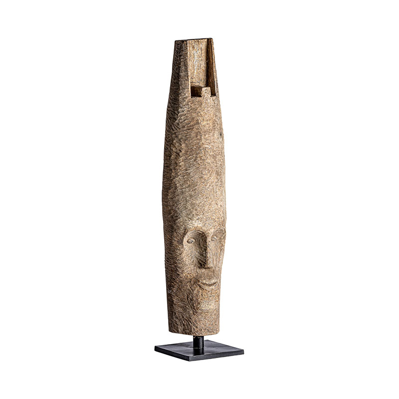 Escultura, de estilo étnico. Fabricado en madera de mango, en color negro envejecido, combinado con hierro, en color natural.