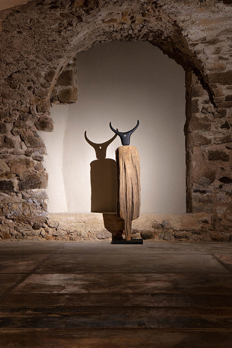Escultura Anuket de estilo étnico fabricado en madera tropical en color negro con acabado envejecido combinado con hierro en color natural.