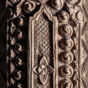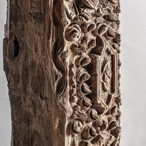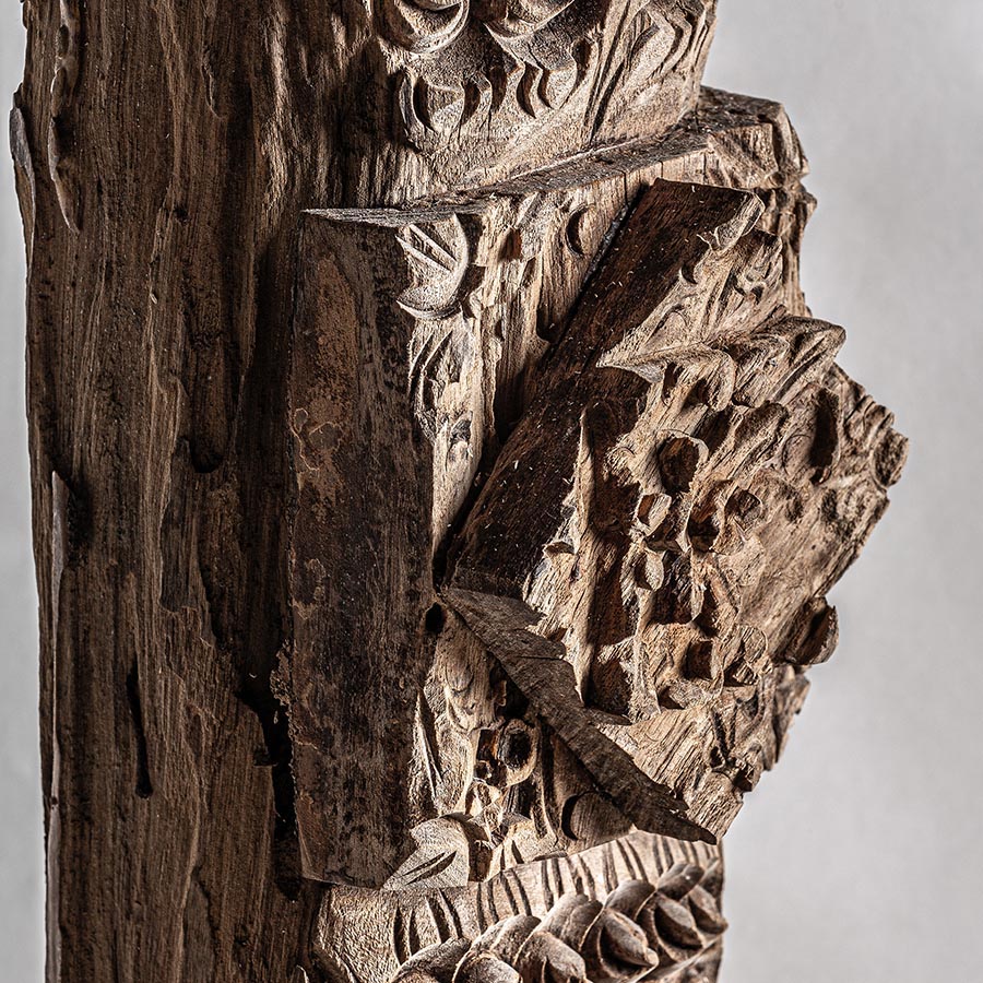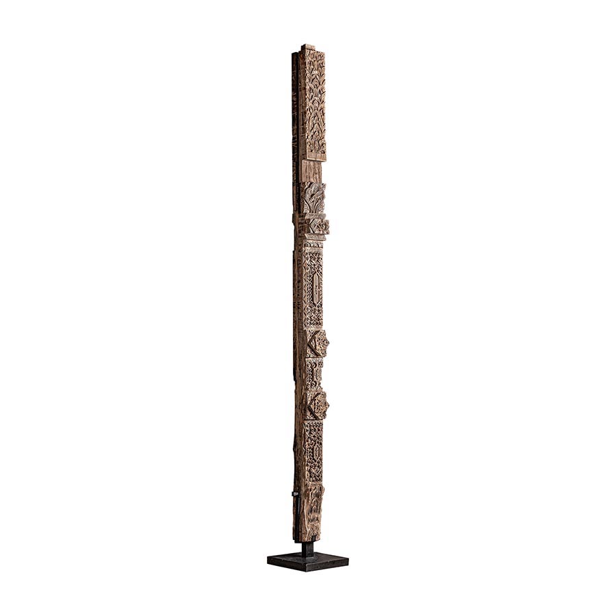 Escultura pie fabricado en madera de teka en color marrón combinado con hierro en color negro.