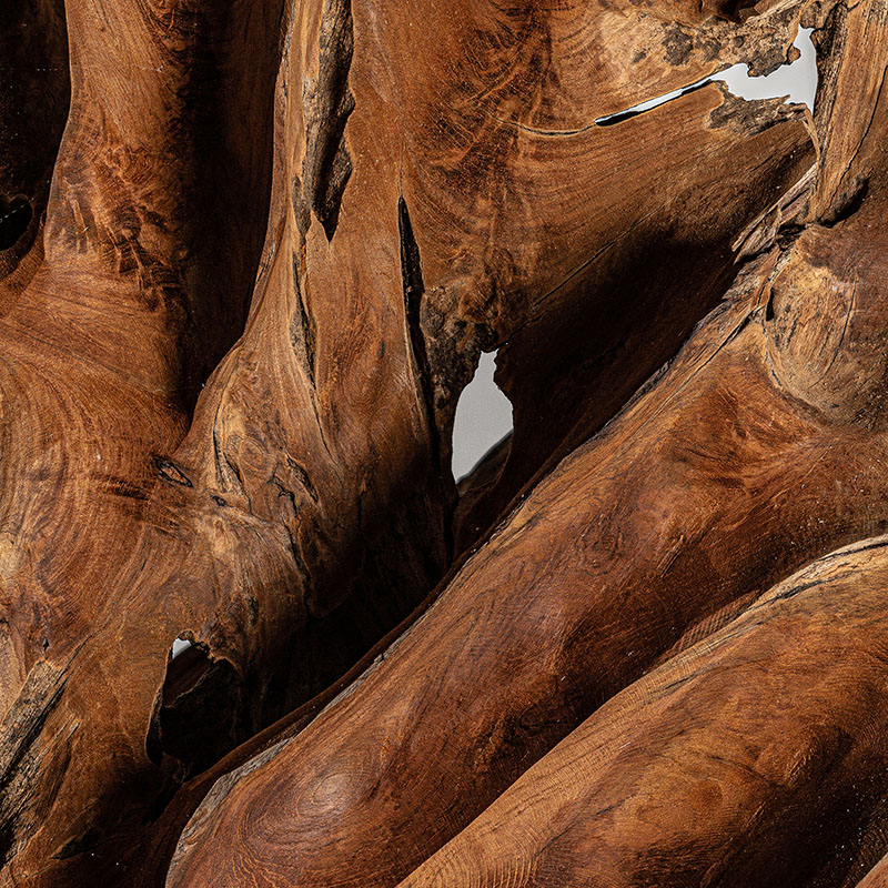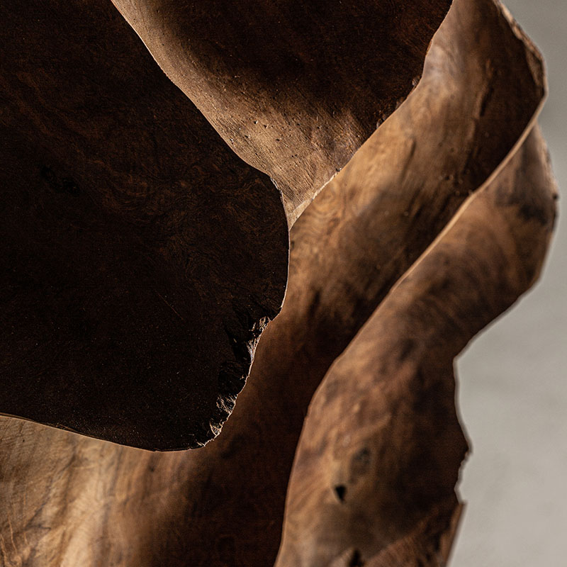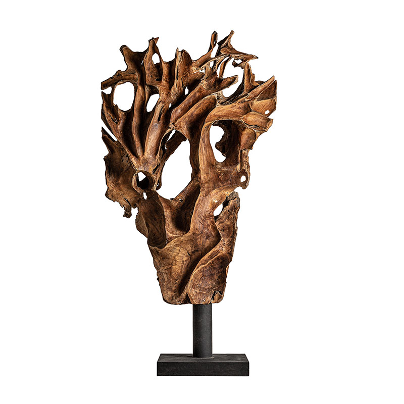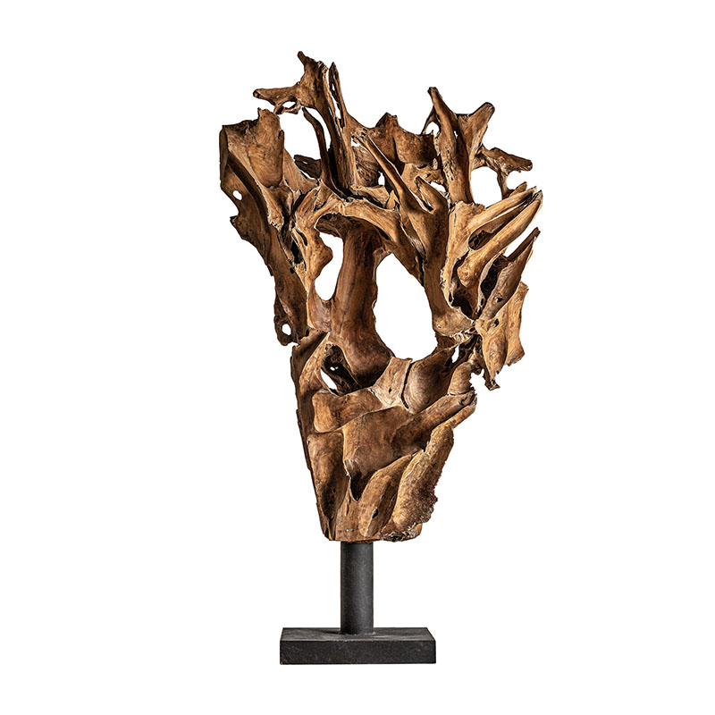 Escultura pie rimini, en color marrón envejecido, de estilo étnico. Fabricado en madera de teka, combinado con hierro.