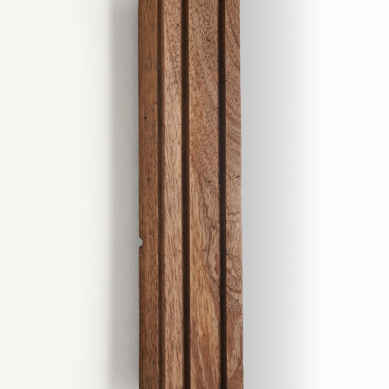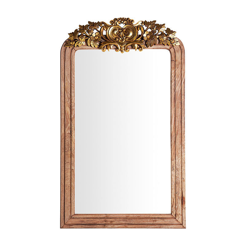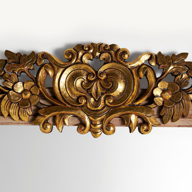 Espejo rectangular, en color marrón/oro tallado, de estilo colonial. Fabricado en madera de teka, combinado con vidrio.