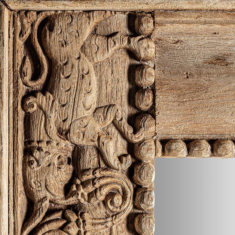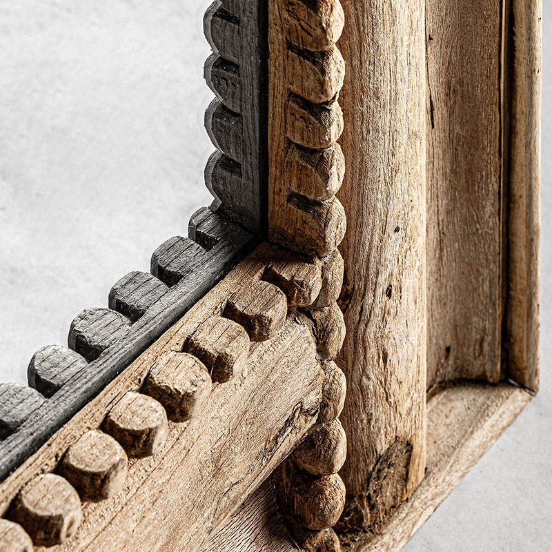 Espejo argeen, en color marrón envejecido, de estilo étnico. Fabricado en madera de teka, combinado con espejo.