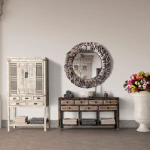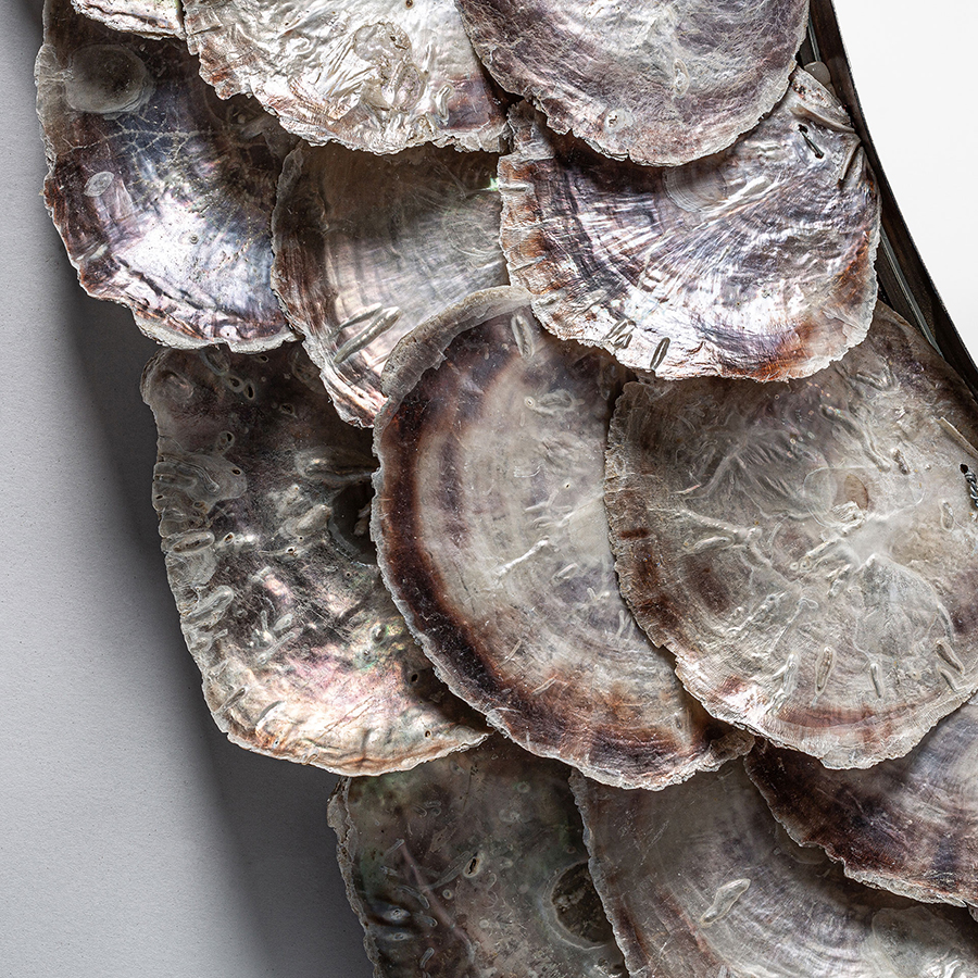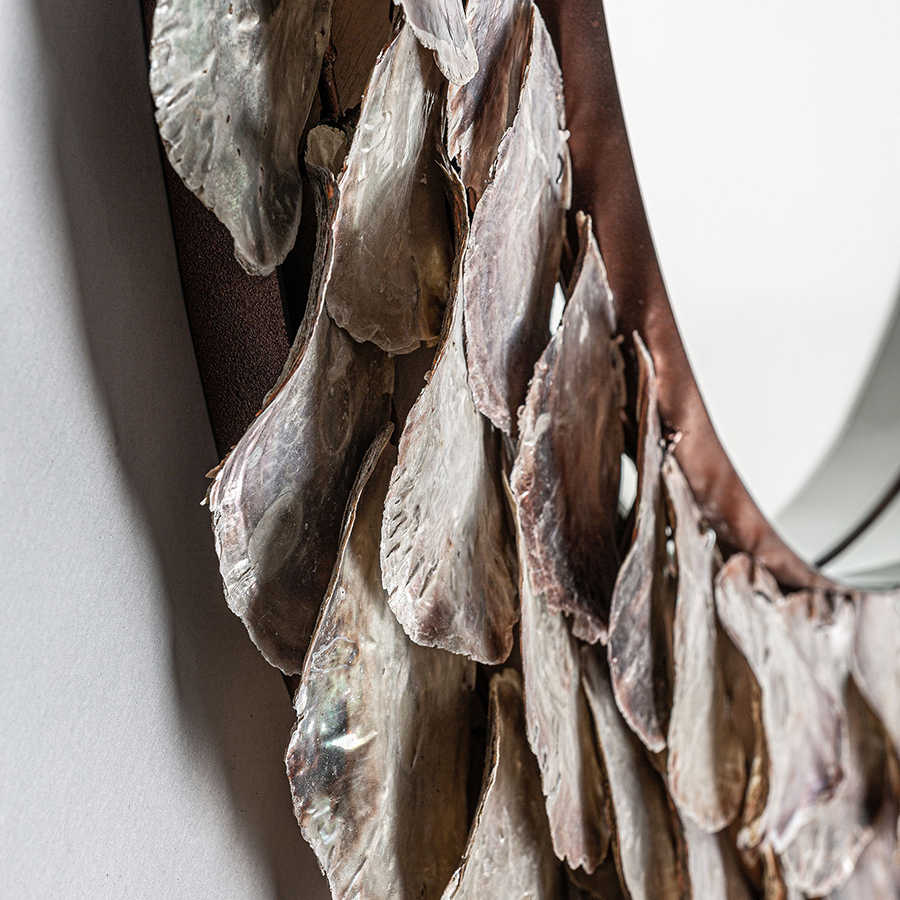 Espejo Inga de estilo nórdico fabricado en acero en color marfil combinado con concha y espejo. Concha de ostra.