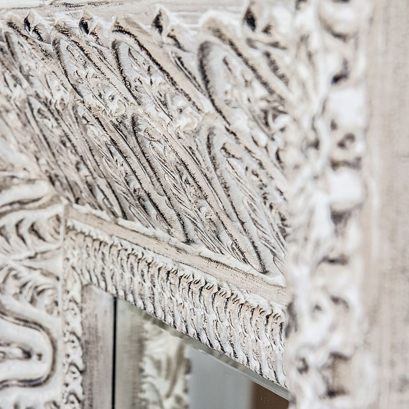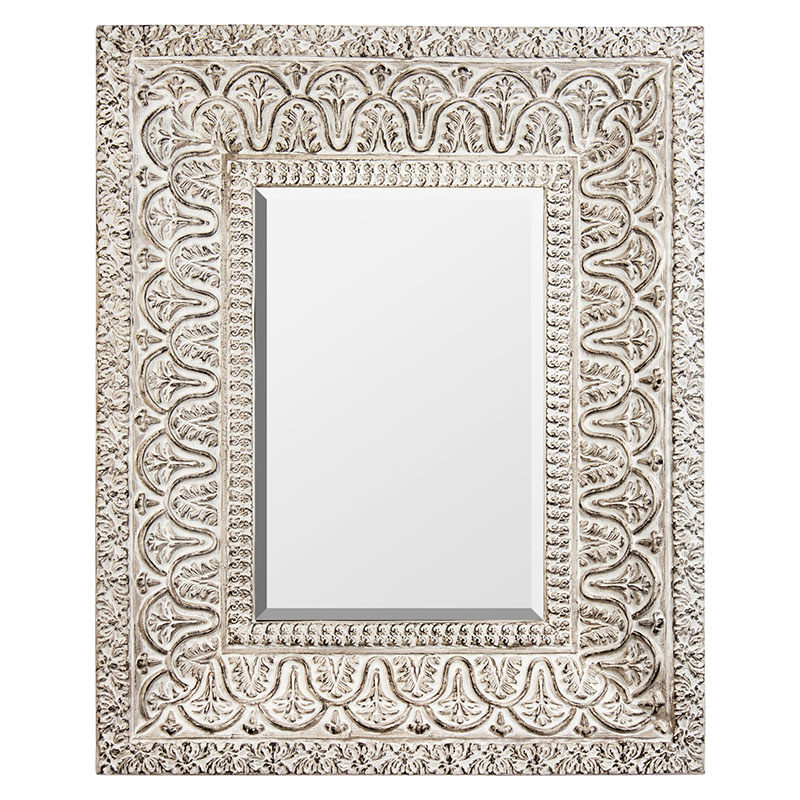Espejo rectangular mosa, en color blanco roto decapado, de estilo provenzal. Fabricado en resina, combinado con espejo.