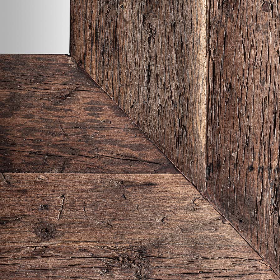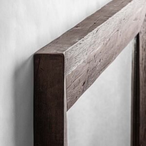 Espejo skorup de estilo colonial fabricado en madera recuperada en color marrón con acabado envejecido combinado con espejo.