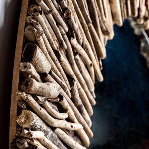 Espejo Varverg de estilo étnico fabricado en madera tropical en color marrón con acabado envejecido combinado con espejo. Bastones madera.