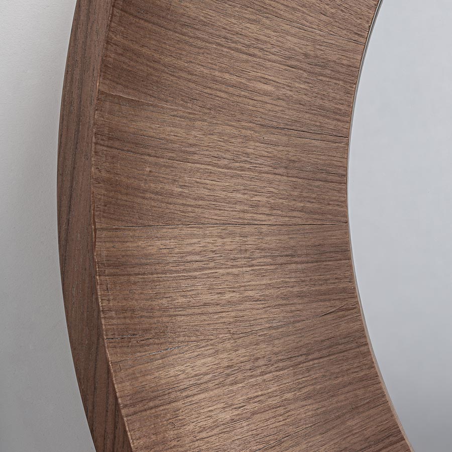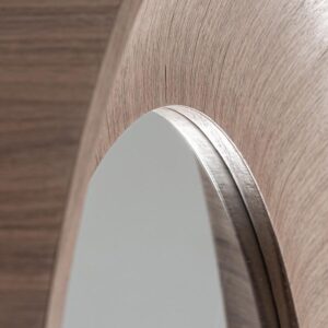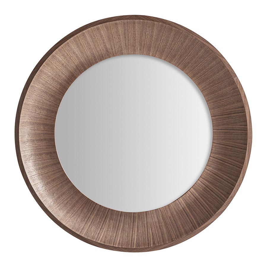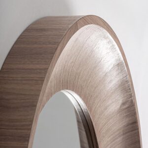 Espejo Zermatt de estilo art deco fabricado en espejo combinado con madera nogal en color marrón claro y madera dm en color marrón.