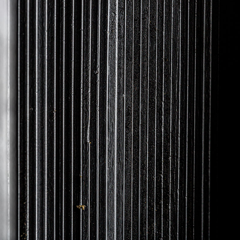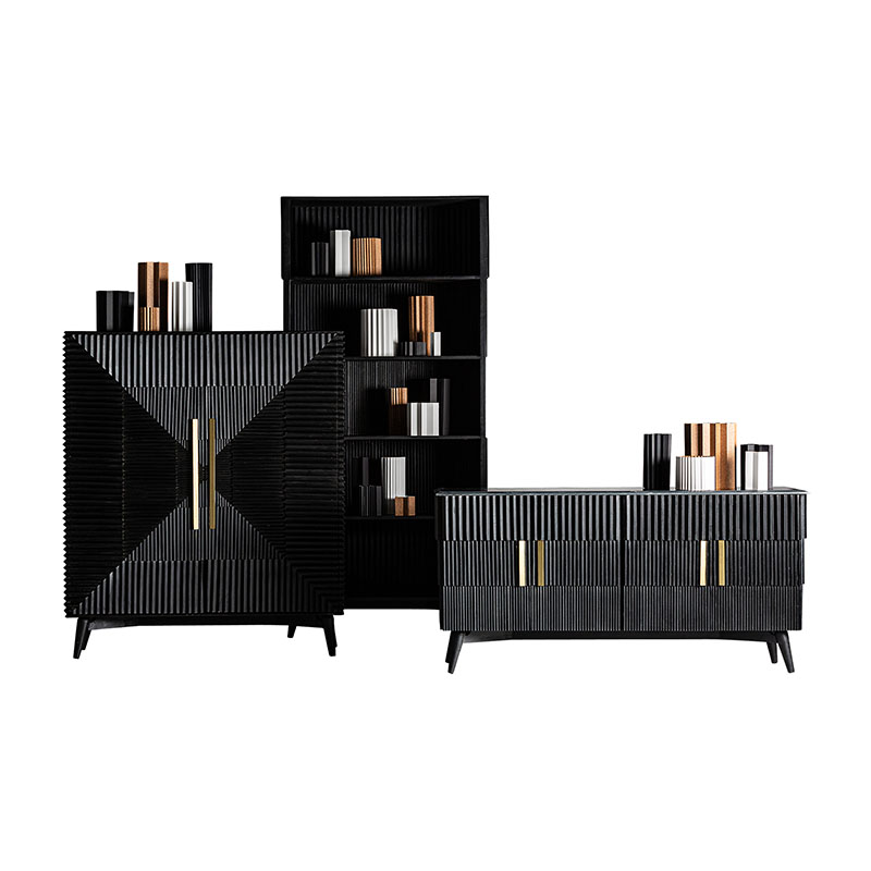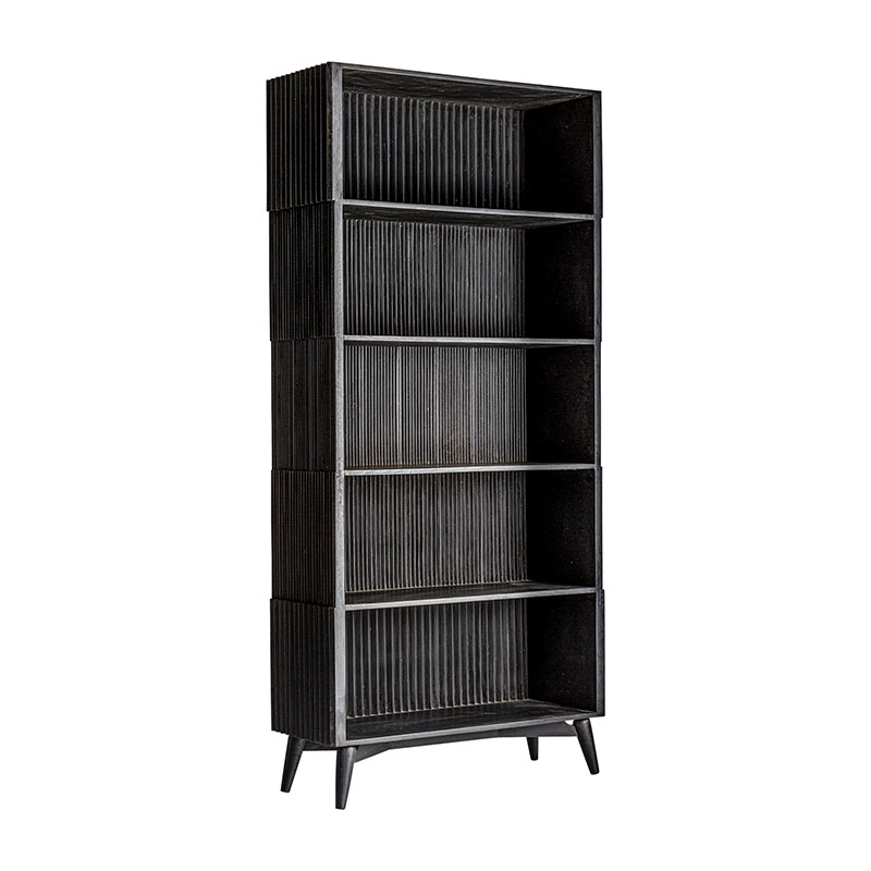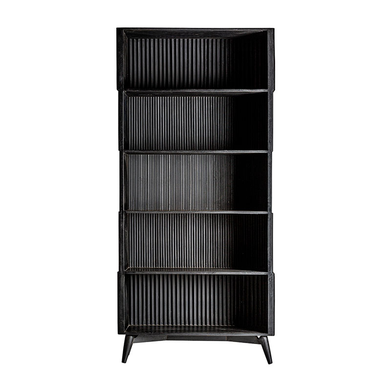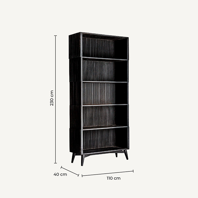 Estanteria Plissé wood de estilo art deco, fabricado en madera de mango en color negro, combinado con hierro en color negro con acabado efecto madera.