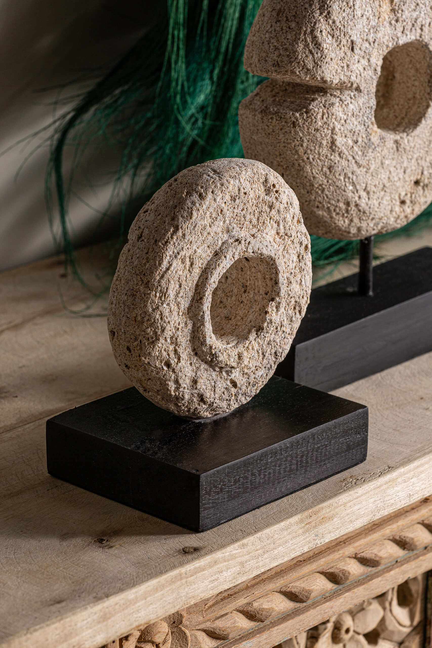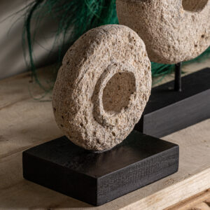 FIGURA DECORATIVA, EN COLOR BLANCO/NEGRO, DE ESTILO CONTEMPORÁNEO. FABRICADO EN PIEDRA, COMBINADO CON MADERA TROPICAL.